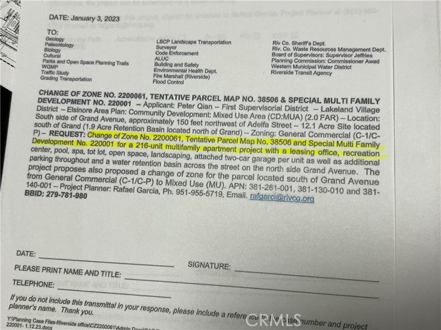 Here is an Opportunity to own a commercial land with lake view. Land is Located in Lake Elsinore on the Grand Ave and Adelfa Street with easy access to orange county. Four lot adjacent to other with around 140 feet frontage on the Grand avenue. This land is a 100% usable flat lot with C1 Zoning on a major street. Listing price includes 4 lots each with 7840 sqft, 871 sq ft., 6969 Sq. Ft and 6534sqft and ait use to have a water well permit. Parcels number for lots and well are; 381-261-002, 381-261-003, 381-261-004 and 381-261-005. Grand avenue is four lanes paved street with street curb and sidewalk. The land has access to city sewer electricity and water lines. Next door parcel nymber 1 has a proposed 216 unit multifamily apartment project which will be built soon. Hurry and pick up this lot for investment.Please see supplements for more information.
