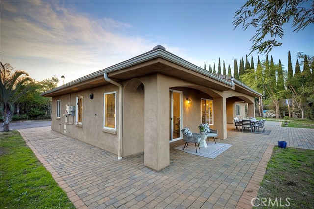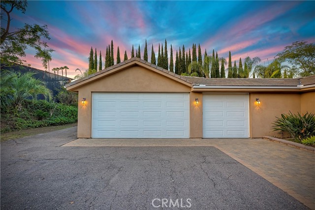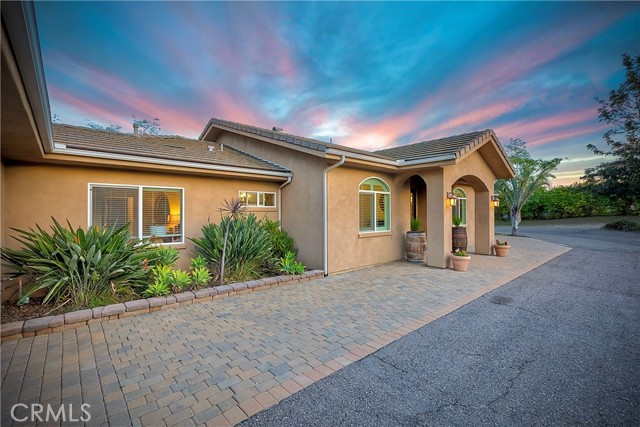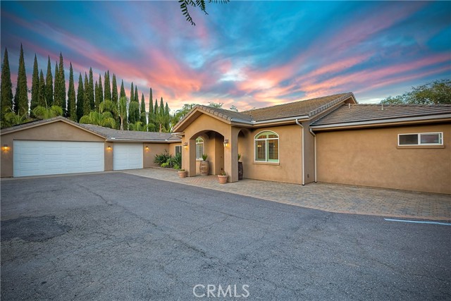 Discover this stunning single-level custom home, beautifully built in 2014 and offering over 3,200 square feet of seamless, modern living on a spacious, fully fenced and gated 1+ acre lot with breathtaking east-facing mountain and valley views. Perfect for families, car enthusiasts, or those seeking versatility with dedicated RV parking and ADU potential, this turnkey gem features no stairs and effortless elegance throughout, plus energy-efficient solar power at an affordable $170 per month. At the heart of the home lies a giant open-concept great room that effortlessly combines the dining area, newly remodeled gourmet kitchen with sleek cabinetry and premium appliances, and cozy family room, all accented by luxurious white vinyl plank flooring and extra-tall ceilings and doorways that flood the space with natural light and an airy grandeur. Tucked away on one side for ultimate privacy, the primary bedroom opens via slider door to the covered paver patio, complete with a spacious walk-in closet and custom luxury shower in the en-suite bath. Down the hall, three additional bedrooms provide flexible space for family, guests, or a home office, alongside a convenient built-in laundry center. Car lovers will appreciate the oversized 5-car garage with ample room for vehicles, a boat, trailer, or workshop, while the property boasts three separate entrances perfect for ADU additions and enhanced privacy—the upper lot with its own gated entrance ideal for RV parking, and the lower lot with a dedicated entrance ready for ADU development. Relax and unwind on the covered paver patio, framing panoramic vistas of the mountains and valley below. Don't miss this rare opportunity—schedule your showing today!
