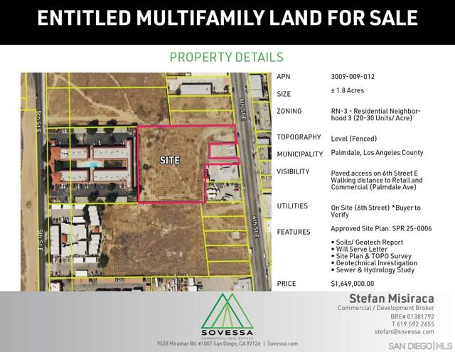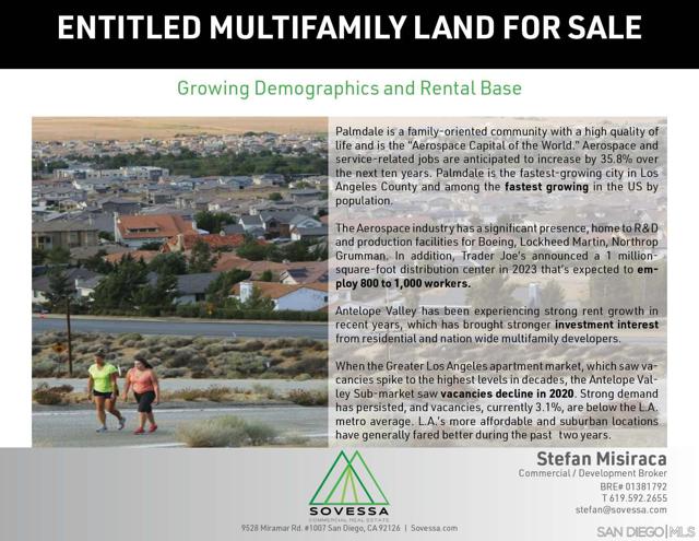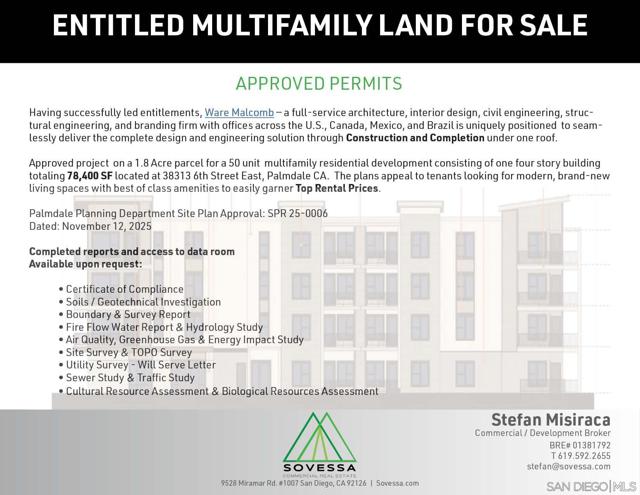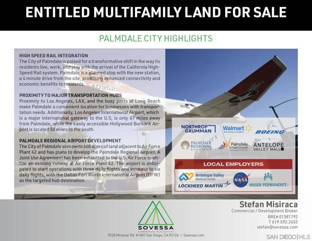 Turn-Key Development Site – This is a entitled land opportunity for 1.8 acres with approvals in place for a luxury four-story, 50-unit apartment community totaling 78,400 SF. Located on 6th Street East & Palmdale Ave with all utilities at the site, this project is positioned to capture Palmdale’s surging demand for high-quality multifamily housing at a time when new supply remains extremely limited. Having successfully led entitlements, Ware Malcomb is fully prepared to serve as your single-source design-build partner, delivering the entire project from groundbreaking to certificate of occupancy under one roof – ensuring speed, cost certainty, and superior execution. This project is perfect for developers and investors seeking a high-yield, low-risk opportunity with best-in-class design and the ability to bring to market in under 12 months. Prime Location & Future Growth Catalysts Located in a Qualified Opportunity Zone offering substantial tax advantages Less than ½ mile from the future Palmdale High-Speed Rail Station – planned as a major hub interfacing: California High-Speed Rail (Bakersfield–Palmdale–LA–Anaheim–San Diego) Brightline West / High Desert Corridor (Southern California to Las Vegas bullet train) Major employment growth: Northrop Grumman, Boeing and NASA are aggressively expanding and hiring in the Antelope Valley, driving strong demand for new workforce housing Palmdale continues to attract renters seeking the most affordable, brand-new housing options within commuting distance of Greater Los Angeles