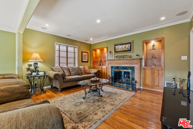 Stunning 2-Story Home in Prestigious Historic View Park A beautifully appointed 4 bedroom, 4 bath residence offering 2,927 sqft of refined living space in the highly sought after Historic View Park neighborhood. The entry showcases gleaming hardwood floors and an elegant stone staircase that gracefully splits to the second level. Downstairs boasts a spacious living room that features a stone fireplace, custom insets with accent lighting, and three large windows that fill the space with natural light. Across the entry, the formal dining room provides an inviting setting for dining and entertaining. The well designed kitchen is equipped with stone countertops, tile backsplash, rich dark wood custom cabinetry with glass front accents, under cabinet lighting, a built-in double oven, and tile flooring. An adjoining eating area offers additional convenience. Just off the kitchen, the laundry room includes matching custom cabinetry and a prep sink, and a powder room. At the rear of the home, the family room features a second fireplace with a wood mantle, lit display insets, and a glass slider leading to the backyard. A downstairs bedroom that is deal for guests or workspace, sits adjacent to a beautifully upgraded bath with wood vanity, stone countertop, vessel sink, and a shower with diagonally set decorative stone tile. Ascend the staircase to a thoughtful upper-level layout: one side leads to the primary suite with its own private bath, while the opposite side offers two additional bedrooms and a hallway bath. One bedroom features direct access to a private patio with rooftop and peek-a-boo mountain views. Another bedroom enjoys a striking view of Downtown Los Angeles from the window. The multi-tiered backyard offers versatile outdoor living, with a partially covered upper concrete terrace and two lower levels combining lawn and hardscape, perfect for relaxing or entertaining. Additional features include recessed lighting throughout most of the downstairs, central heating and air, ceiling fans in all bedrooms, and a two-car garage. Close proximity to Kenneth Hahn State Park, scenic hiking trails, and neighborhood walking paths adds to the home's appeal. Come be the newest neighbor!