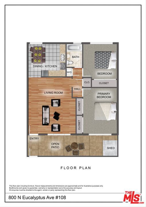 Discover this 2 bed 1 bath ground floor condo tucked inside a classic mid century courtyard community. A private enclosed patio sets the tone, an ideal spot to relax or enjoy a quiet moment outdoors. Step inside to a bright open living room with recessed lighting, built in shelving, and a large window that fills the space with natural light. The remodeled kitchen blends clean modern finishes with mid century flair, featuring white cabinets, stone countertops, newer appliances, and a sputnik style light above the dining area. The updated bathroom feels fresh and elegant with a stone top vanity, gold toned hardware, a black arched mirror, and a tiled shower/tub. Both bedrooms offer a minimalist calm aesthetic anchored by a custom floor to ceiling wardrobe system that maximizes storage. Enjoy in unit laundry, an extra storage closet, a private shed, and one secured subterranean parking space with access from Lamos Street. The complex offers secured entry, landscaped courtyards, and classic mid century design elements throughout. Located near Inglewood's growing sports (Sofi and Intuit Dome) and entertainment district (Kia Forum), shopping, dining, public transportation, and convenient 405 access to the Westside and Beach Cities.