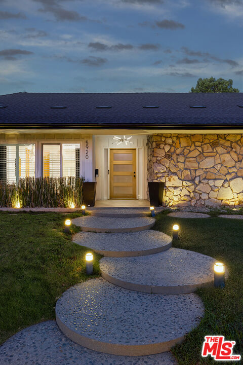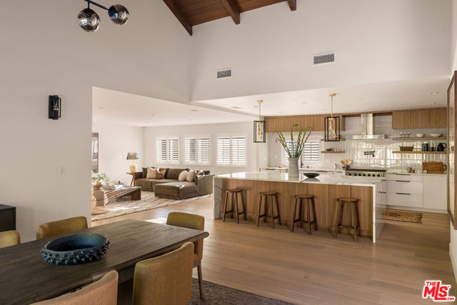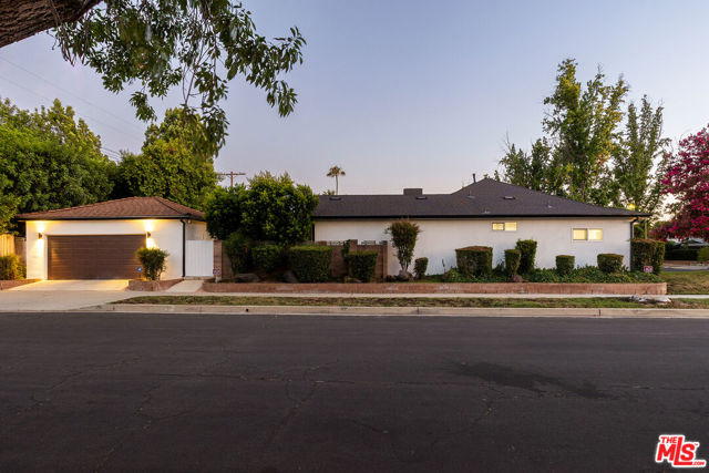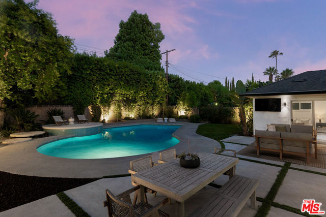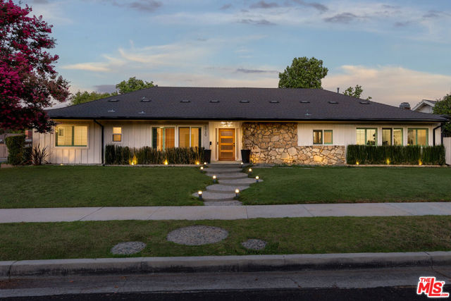 Stunning Mid-Century Charles DuBois Architectural with Pool in Prime Woodland Hills. Located on a desirable corner lot in one of the most sought-after areas of Woodland Hills, this impeccably remodeled Mid-Century Charles DuBois home offers over 3,000 sq ft of thoughtfully designed living space with 4 bedrooms and 3.5 bathrooms. Step through a custom oversized front door into a sun-drenched, open-concept interior featuring soaring ceilings with exposed beams, wide-plank white oak floors, and a dramatic Venetian plaster double-sided fireplace separating the formal living and dining areas. The chef's kitchen is a showpiece designed for both entertaining and everyday living. Highlights include a striking waterfall island, sleek wood and glossy white cabinetry, gold vein Calacatta countertops, and top-tier appliances including a panel-covered Fisher & Paykel fridge, Miele dishwasher, Frigidaire double oven, and Thor gas range. No detail was overlooked in this one-of-a-kind renovation: designer light fixtures, floating vanities, custom accent walls, solid extra-tall wood doors, and premium tile and finish selections throughout. The luxurious primary suite features cathedral ceilings with a central beam, a spa-like bath with a freestanding tub, floating double vanity, oversized walk-in shower, and a massive custom walk-in closet. Additional highlights include a spacious laundry room and pantry with smart controls, and a separate en-suite bedroom located on the opposite wing of the home ideal for guests or multigenerational living. Step outside to a private resort-like entertainer's backyard with newly designed hardscape, lush modern landscaping, and a large sparkling pool. Major upgrades include newer roof, dual HVAC systems, updated electrical panel, tankless water heater, recessed lighting, CAT wiring, plumbing, all new pool equipment and solar panels for the house which offers a huge savings. A detached garage with a private side entrance offers excellent ADU potential. Ideally located near top-rated charter schools, Bristol Farms, Calabasas Commons, Topanga Village, and the beloved local Farmer's Market, with quick access to the 101 freeway. The best value in Woodland Hills based on quality remodel, lot size, privacy and location.