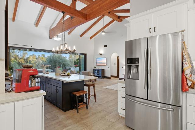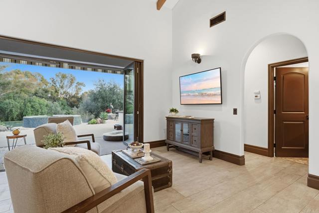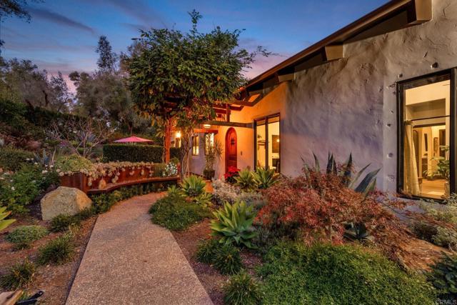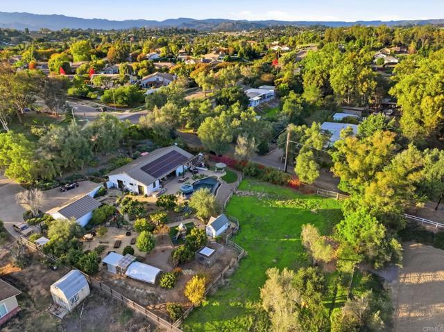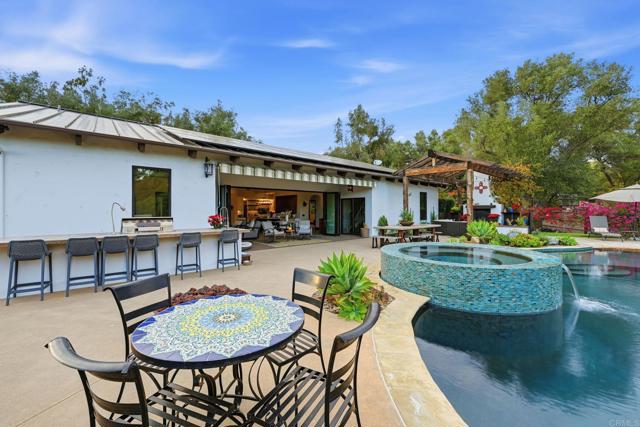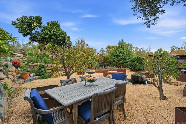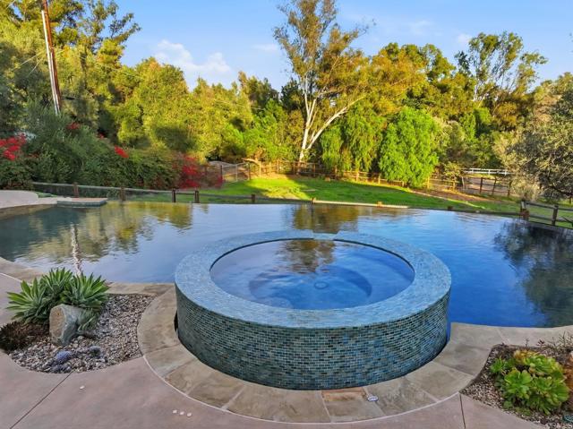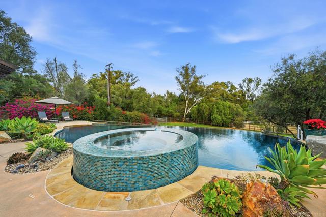 Welcome to 1111 Palomino Road, where luxury, nature, and timeless design come together to create one of Fallbrook’s most enchanting estate retreats. Set atop gently rolling grounds and surrounded by resort-style amenities, this farmhouse-inspired sanctuary immediately captivates with warm elegance and unforgettable charm. From the moment you arrive, you’re greeted by artful landscaping, tranquil water features, and a sense of peaceful seclusion that feels worlds away—yet every inch of the property has been thoughtfully crafted for modern living, effortless comfort, and unforgettable moments, and was proudly awarded 2025 FALLBROOK GARDEN OF THE YEAR. Discover the magic of this beautifully crafted estate that captures the essence of refined country living. Warm, inviting, and effortlessly elegant, the home blends timeless design with sophisticated upgrades to create a space that feels both inspiring and grounding. Smooth stucco, custom corten steel accents, and professionally maintained landscaping with uplighting offer a striking welcome, immediately setting the tone for the craftsmanship found throughout. A handcrafted Mission-style Dutch door opens to a bright interior where wide porcelain plank flooring and recessed lighting highlight an open, airy layout. Modern convenience meets rustic charm with a fully integrated smart home system controlled via cell phone and Bluetooth, dual AC units, and a whole-house generator. Each bedroom features sliding-door access to the outdoors, enhancing the seamless indoor-outdoor connection. The kitchen stands as a true centerpiece—featuring expansive quartz counters, a hammered copper farmhouse sink, premium shaker cabinetry, generous prep space including a pot filler, stainless steel appliances, and custom lighting adjustable to your needs. From here, collapsible bi-fold doors open wide to blur the boundary between indoors and out, instantly expanding your living space into a breathtaking outdoor oasis. The resort-style grounds are a world of their own. A built-in outdoor kitchen with grill, sink, and refrigerator, two fireplace features, and three serene water elements create the perfect backdrop for gatherings. At the heart of the property lies a spectacular infinity pool with a beach-style entrance and spa, surrounded by Cameron flagstone and enveloped in treetop views. An electric awning shades the back patio, while in-ground Bluetooth speakers elevate the ambiance. Nature enthusiasts will love the expansive edible garden framed by custom Corten steel planters and an orchard offering a variety of fruit trees—including fig, peach, nectarine, lemon, grapefruit, navel orange, lime, white peach, apple, loquat, pomegranate, and Fuji apple—supported by a property-wide drip irrigation system. A productive chicken coop yields 4–5 eggs daily, and a dedicated dog run with automatic watering, along with a life-sized children’s dollhouse/playroom and swing set, add thoughtful touches for all. Beyond the cultivated spaces, the backyard’s open area offers room for oversized RV parking, additional structures, an ADU, and even future subdivision—providing outstanding flexibility. Practical luxury continues with an owned solar system, EV charging in the garage, and a long-lasting standing-seam steel roof. Every corner of this exceptional property radiates charm, intention, and craftsmanship. Beautiful, functional, and truly unforgettable, 1111 Palomino Road is more than a home—it’s a lifestyle, a sanctuary, and a rare Fallbrook treasure you’ll never want to leave.