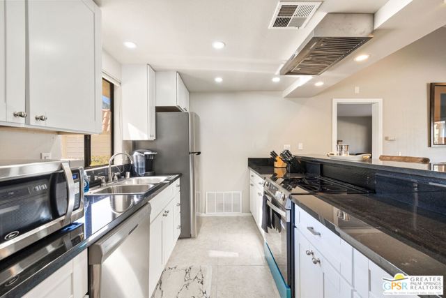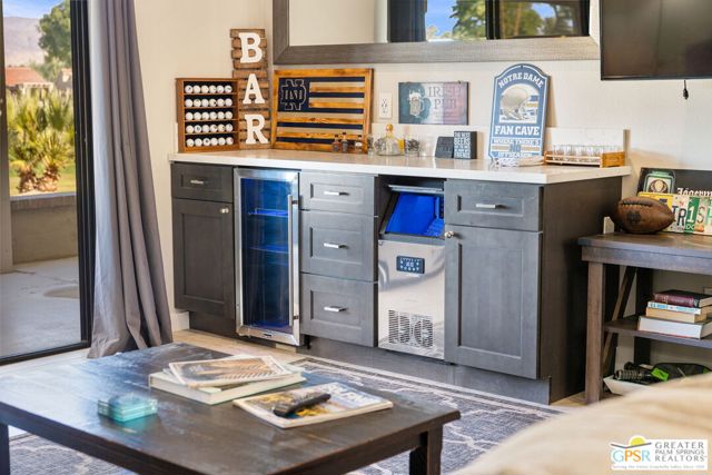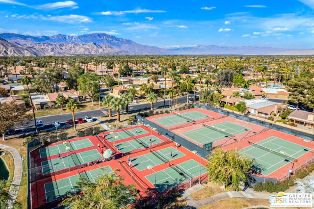 Introducing this highly sought-after Vintage Model Plan, perfectly situated inside the gates of Palm Desert Resort CC and overlooking the 15th fairway with spectacular golf course and mountain views. Inside, you'll find an inviting open-concept floor plan centered around a newly remodeled kitchen featuring expansive granite countertops with barstool seating, abundant cabinetry, and new appliances (2025). The thoughtful layout places the owner's suite and bath on one side of the home, with the guest bedroom and bath on the oppositeideal for privacy and making this one of the community's most desirable floor plans. The living room is an entertainer's delight, complete with a custom bar, beverage refrigerator, ice maker, and additional storage. Both bathrooms have been beautifully updated, with the primary suite boasting a luxurious two-person jetted tub. An expanded indoor laundry room adds everyday convenience. Relax and unwind on the extended back patio, complete with a patio awning, outdoor dining area that seats six, fire pit, and even an outdoor freezerperfect for al fresco entertaining while enjoying the fairway and mountain panorama. The home is offered turnkey furnished for immediate enjoyment! Palm Desert Resort CC offers an 18-hole championship golf course, a newly renovated clubhouse, 20 pools and spas, and the Coachella Valley's premier pickleball and tennis club, making this a perfect primary residence, second home, or vacation rental.