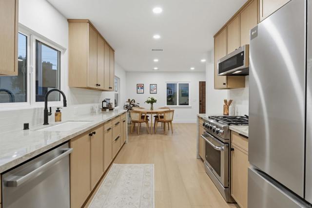 Just one block from the beach, this stunning home offers a rare blend of custom design & premium craftsmanship. Situated on a quiet corner lot in coastal Oceanside. This single-story, 3-bedroom, 2-bathroom home has been fully reimagined with high-end materials that go far beyond a standard remodel. Natural light fills an open-concept living space featuring Taj Mahal natural quartzite countertops, custom solid white oak cabinetry, and professional-grade stainless steel appliances, creating a refined coastal-modern aesthetic. The outdoor areas are just as impressive. A welcoming timber-framed front porch leads to real-grass front and back yards with full irrigation, all enclosed by gorgeous Redwood privacy fencing. The long driveway provides off-street parking for 3 vehicles, in addition to a detached garage — This turnkey beach retreat offers unmatched value for coastal property in Southern California!