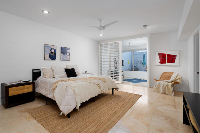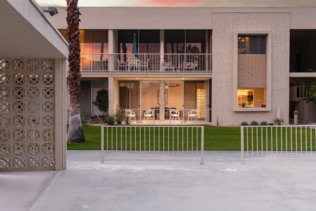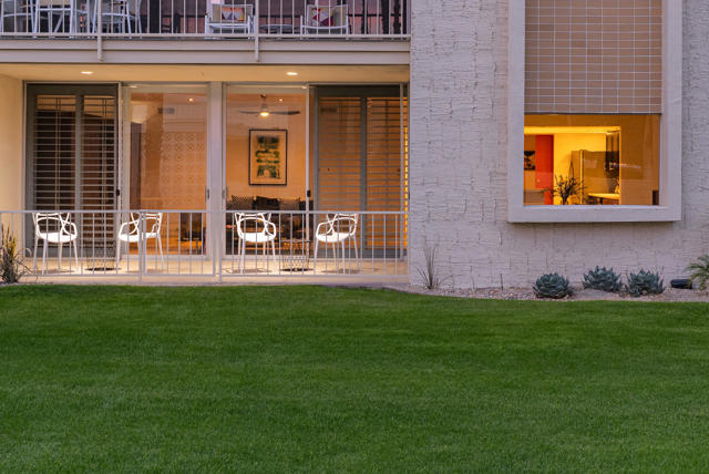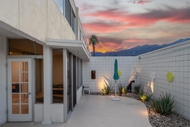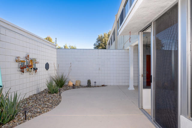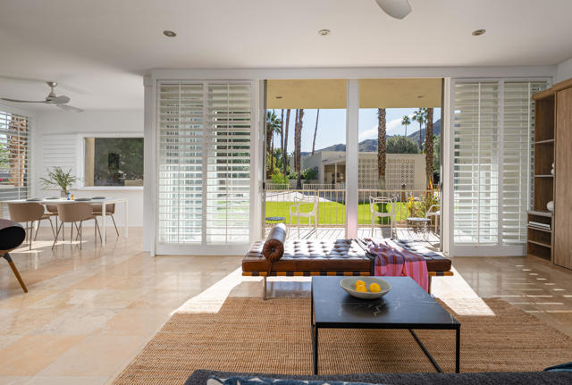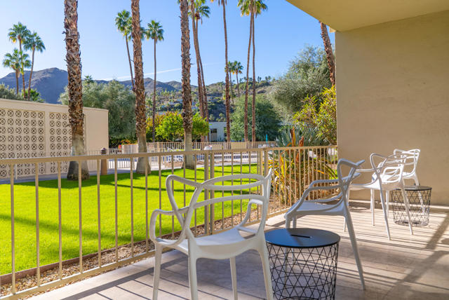 Ease into resort living in this spacious late-century modern one bedroom + den, two bath condominium, designed by renowned architect Richard Harrison. Located within the much desired Seven Lakes Golf & Country Club, this south facing unit offers views of iconic Southridge from its leisure terrace. Inside, the expansive floor plan showcases clean lines, travertine tile flooring throughout, abundant natural light and versatile living and dining spaces. A custom Murphy bed finished in beautiful wood cabinetry allows for an easy guest room. The contemporary kitchen offers ample quartz counters, gleaming stainless appliances and abundant storage. Your generously sized primary suite is complemented by a large walk in closet, a huge bathroom with built in cabinets and a walk in shower, while the second full bathroom is tucked privately at the rear of the home. A separate den makes a perfect work from home space or Zen room. Then step outside to your private rear courtyard, ideal for entertaining, dining al fresco, or enjoying tranquil mornings surrounded by lush surroundings. A private one-car carport with additional storage, and a ChargePoint EV charger are included for your convenience. Other upgrades include new plumbing with a new main water line and updated HVAC. Out your door, the largest of 7 Lakes' 15 tranquil pools is just steps away. Past the 24-hour guarded gate, 'The Gem of the Desert' offers a unique elevated lifestyle with its Ted Robinson-designed 18-hole executive golf course and the lively William Cody designed clubhouse waiting to welcome you to its formal dining room, casual cocktail lounge, and a terrace overlooking the waterfall-fountain. Welcome home!
