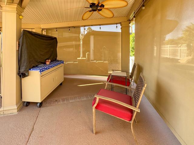 Outdoor Resort Indio is a class A only RV resort and this is an RV lot.Start your morning with coffee under your private pergola, featuring an Aluma Wood shade structure and custom European shades, while savoring the serenity of this exceptional corner lot in Phase 2. Just steps from the pool, hot tub, laundry, and shower facilities, this rare gem combines luxury, privacy, and convenience in one inviting retreat. Enclosed by a tall ficus hedge maintained by the HOA, the patio dining area offers a secluded space perfect for relaxing or entertaining friends.This outdoor oasis boasts a fully equipped kitchen with granite tile countertops, a cooktop electric stove/oven, refrigerator, dishwasher, stainless steel sink, garbage disposal, and instant water heater. Ample storage is provided by a 6-foot Kobalt pantry, matching countertop units, and a stainless-steel storage cart. The space is furnished with a large table, two swivel chairs, four Sunbrella-upholstered chairs, and a large umbrella, ensuring style and comfort. A 65' smart TV mounted on a rolling storage cart completes this luxurious and functional retreat, making it perfect for enjoying the best of luxury RV living.