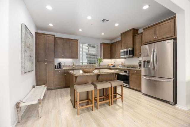 Welcome home to this model-perfect townhome in the gated community of Solana, at Skyline. This stunning home features an entry-level bedroom and full bath, with two matching primary suites on the third floor, each with a full bathroom. Both primary suites also include full walk-in closets. Enjoy the open-concept great room with a double slider to a walkout deck for your morning coffee or evening relaxation over looking the community pool. The kitchen boasts a slab granite island, handsome wood shaker cabinetry, LED lighting, stainless steel appliances, with gas stove cooktop and luxury vinyl flooring. The home is equipped with smart home features, air conditioning, fire sprinklers, an ADT security system. Two-car garage provides ample storage space. Community amenities include a pool, spa, BBQ area, playground, and extra guest parking with EV spots. Located near Bressi Ranch shopping, countless restaurants, local parks, hiking trails in Rancho Carrillo, and just minutes from the best coastal beaches and I-5 for effortless commuting. Don't miss this incredible opportunity to own a beautiful townhome in a highly sought-after communities!