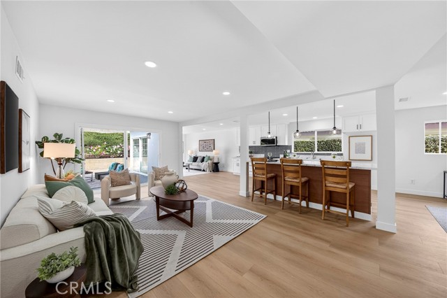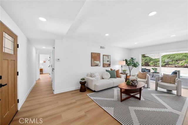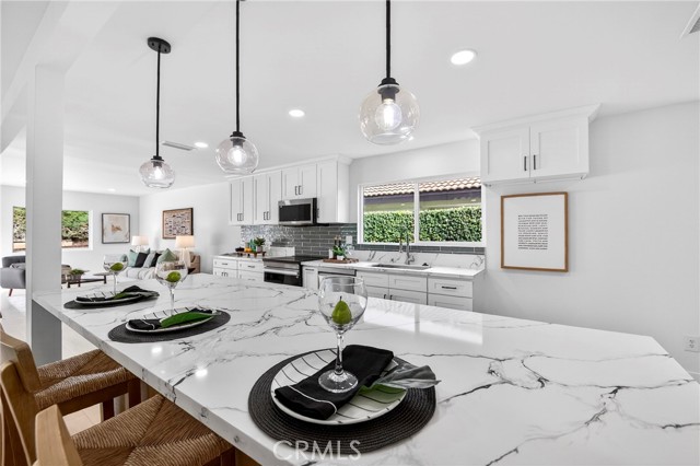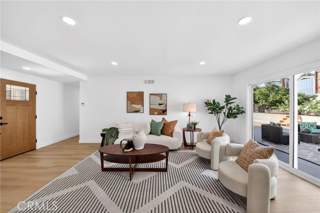 Pleased to introduce a beautifully renovated home, wholly redesigned throughout with a contemporary style, situated on a picturesque, tree-lined street in Fullerton, adjacent to a cul-de-sac within a highly sought-after neighborhood. Upon entering through the front door, you are welcomed by a bright and open interior layout that harmoniously connects each living space, creating a warm and comfortable setting for joyful family evenings. The master bedroom offers the convenience of a walk-in closet and features a wall-like glass sliding door that opens directly to the backyard, allowing you to enjoy the fresh morning air. The en-suite master bathroom is designed in a sleek, contemporary style, with a shower booth, tile flooring, and vanity that blend together seamlessly. The chef’s kitchen is designed for both beauty and functionality—complete with custom cabinetry, quartz countertops, premium stainless steel appliances-perfect for entertaining and everyday living, and a large island which stages the room's design by adding style and functionality to the most popular spot in the house. The spacious backyard is ideal for relaxing, gardening, and entertaining. Additional highlights include an attached 2 car garage, long driveway for extra parking. Just minutes from Amerige Heights Town Center, offering shopping, dining, and recreation.