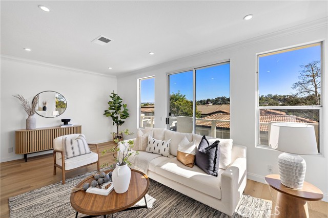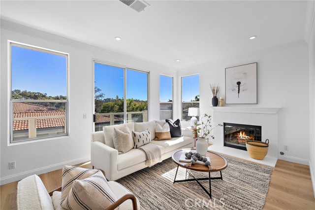 Set within an ideal Laguna Niguel location, this fully remodeled corner residence offers light filled living and effortless access to everything that defines coastal Southern California. Shopping, dining, entertainment, renowned surf breaks, golf courses, and scenic hiking trails are all just minutes away, creating a lifestyle that feels both active and connected. This two bedroom, one bathroom home has been thoughtfully updated with quartz countertops, stainless steel appliances, modern lighting, updated hardware, and a palette of designer neutral paint tones. Laminate flooring flows throughout the space, enhancing the clean and cohesive feel. The living room is bright and welcoming, anchored by a cozy fireplace that adds warmth on cooler coastal evenings. Sliding doors open to a private balcony, extending the living space outdoors. The spacious primary bedroom features both a walk in and reach in closet, while the second bedroom offers flexibility as a guest room, home office, or nursery. Laundry hookups are conveniently located inside the unit, and with no residence below, the home enjoys an added sense of privacy and quiet. A convenient attached single car garage with direct access completes the offering. Community amenities include a pool, spa, and fitness center. Turn key and well positioned, this residence offers a refined coastal lifestyle and is ready for its next chapter in Laguna Niguel.