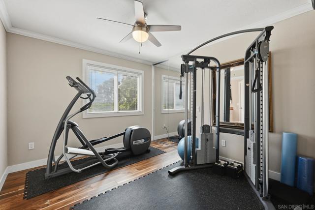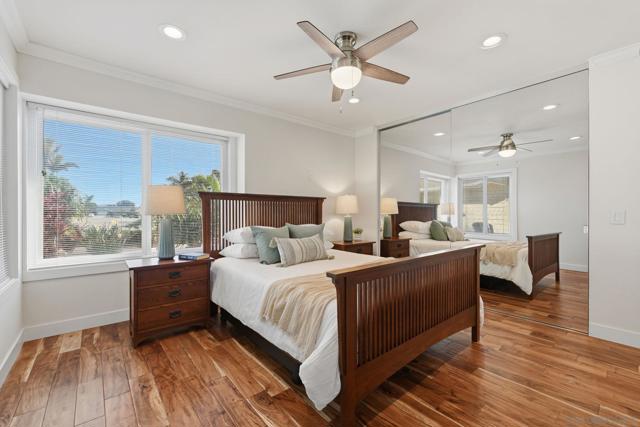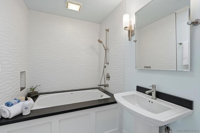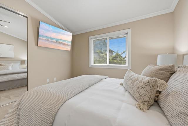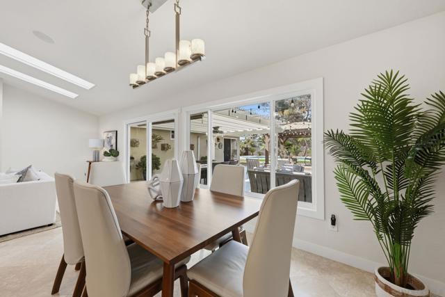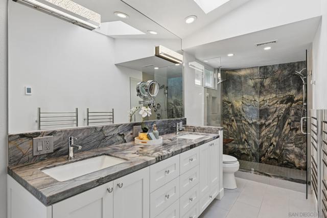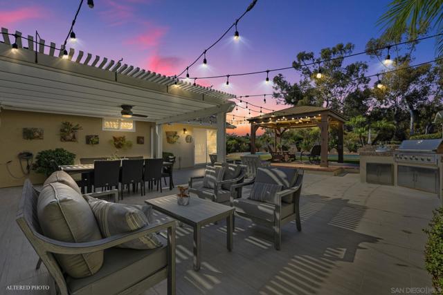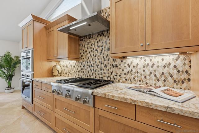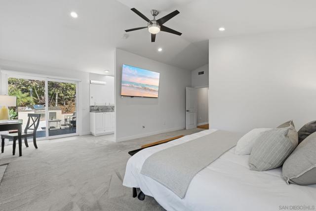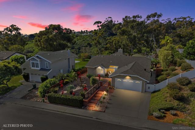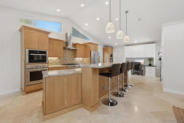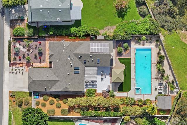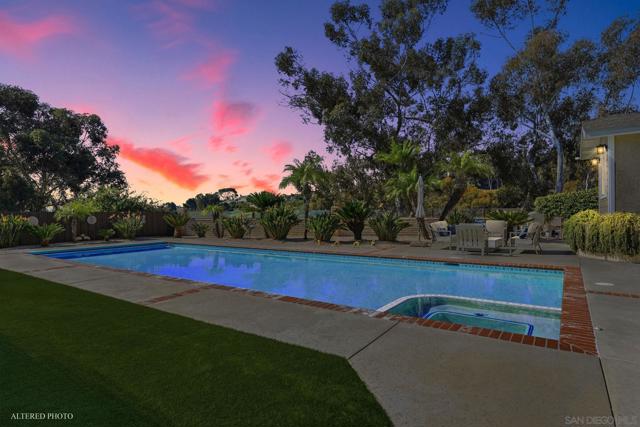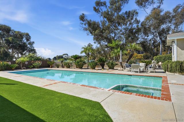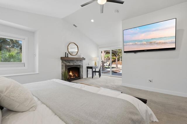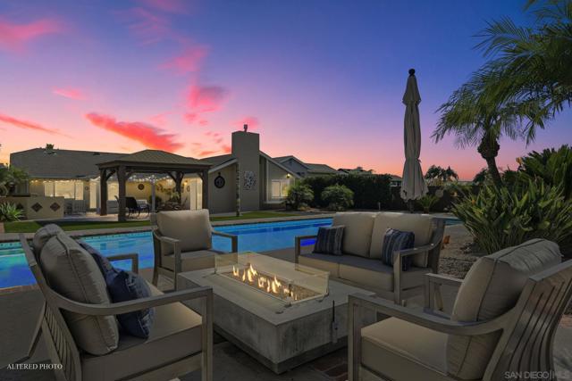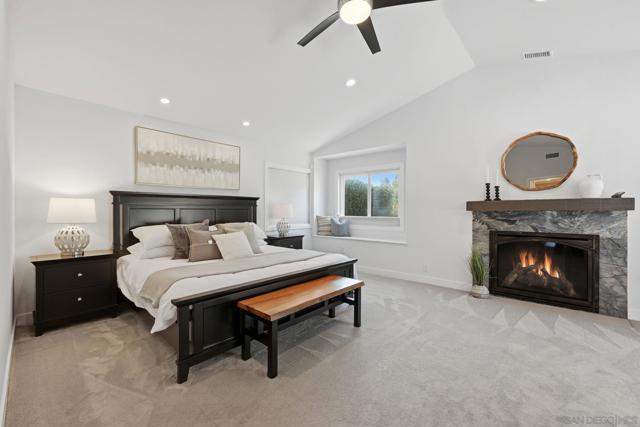 Welcome to this rare single-level luxury home in Carlsbad, fully customized & thoughtfully remastered from top to bottom. Set on an elevated half-acre lot, this 4-BR, 3.5-BA residence offers 2,314 sq ft of refined living space with exceptional privacy—truly unique. The open-concept great room features vaulted ceilings, expansive windows, and abundant natural light, complemented by acacia hardwood floors, crown molding, recessed lighting, and surround sound. The chef’s kitchen is equipped with alder shaker cabinetry, quartzite countertops, walk-in pantry, & premium appliances including a 36” range with griddle, Thermador steam oven, Miele convection microwave, Bosch built-in coffee machine, and InstaHot dispenser. The living room is anchored by a dramatic 60” remote-controlled fireplace. The primary suite is a private retreat with a 42” gas fireplace, custom walk-in closet, and spa-inspired bath with heated floors, heated towel racks, frameless shower, and dual temperature controls. Secondary bedrooms and baths feature upgraded lighting, modern tile, and refined finishes. Smart and energy-efficient upgrades include owned solar, EV charging, QuietCool whole-house fan & central air, Ring security, & WiFi-enabled systems.Resort-style backyard offers a 51x18 ft pool w/ automatic cover, spa, newer equipment, and a custom cabana with hot/cold water and mini-split HVAC, BBQ, firepit, outdoor shower, and lush lighting. Ideally located near top-rated Carlsbad schools, this turnkey home delivers luxury, technology & resort style living at its finest.