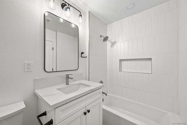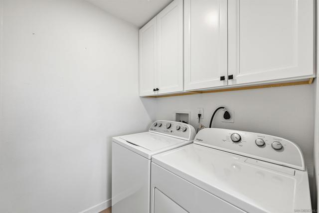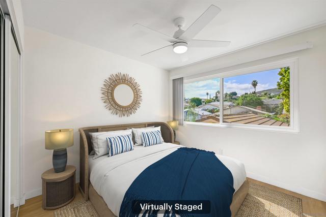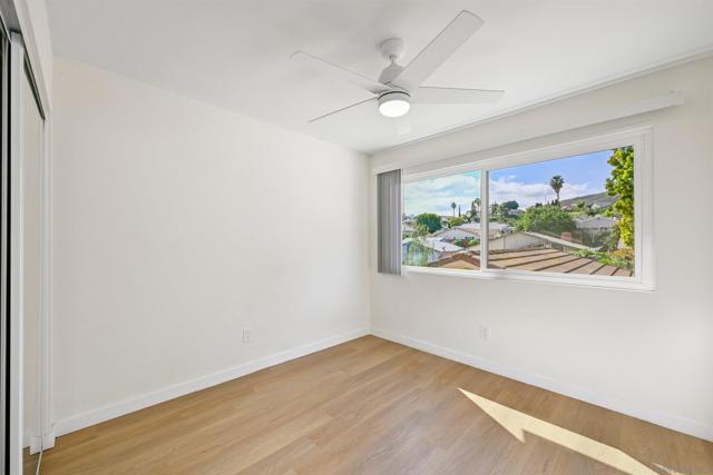 Prepare to be impressed by this showcase townhome located in the highly sought-after Westwood Townhomes community, perfectly positioned on a premium lot with picturesque park and mountain views! Designed for effortless indoor-outdoor living, the home features spacious patios at both the front and back—ideal for al fresco dining, relaxing, or entertaining while taking in the serene surroundings and mesmerizing views. Extensive renovations elevate every corner of the home, including luxury vinyl wood plank flooring, recessed lighting, new white cabinetry, countertops, stylish lighting and fixtures, new Milgard windows and sliders and mini split systems. The gourmet kitchen is a true chef’s delight, showcasing quartz countertops, a tiled backsplash, farmhouse sink, pendant lighting, stainless steel appliances, and a separate island with a striking waterfall edge—perfect for casual dining or bar seating. Just off the kitchen is a convenient laundry room with new washer and dryer, along with a beautifully updated downstairs bathroom featuring a quartz countertop. A modern staircase leads you upstairs to the bedrooms, where the spacious primary bedroom serves as a true retreat, complete with tranquil views, dual closets, and an en-suite bathroom with quartz countertops and a large walk-in shower wrapped in white marble-look tile and elegant herringbone marble accents. Secondary bedrooms are located just down the hall and share a well-appointed bathroom with a tiled tub/shower combo and white quartz countertop. A separate detached garage adds everyday convenience. Residents enjoy exclusive membership to the Westwood Club offering a pool, spa, sauna, pickleball and tennis courts, gym, BBQ area, basketball court, miniature golf, clubhouse, playground, and scenic walking paths. Located in the award-winning Poway Unified School District and close to entertainment, restaurants, shopping, transportation and just minutes to the beaches. This is an exceptional opportunity to own this showcase home!