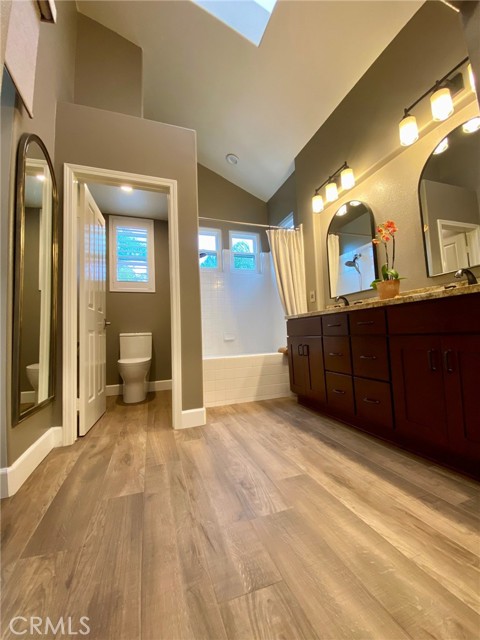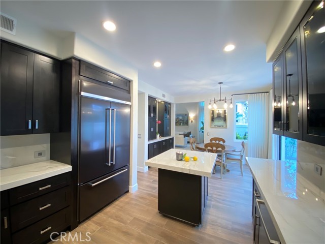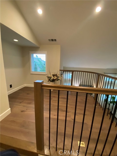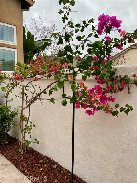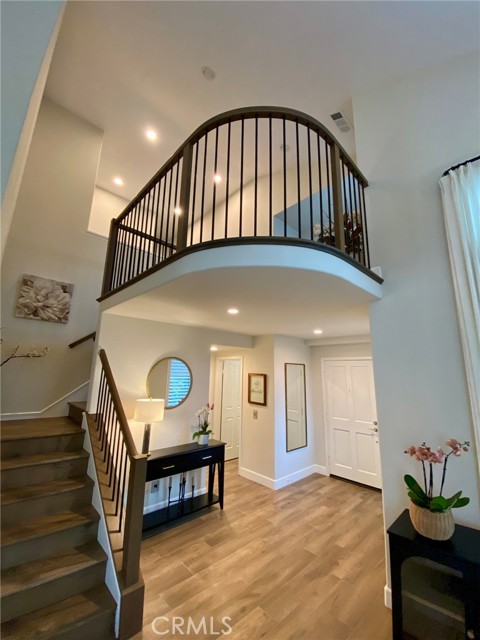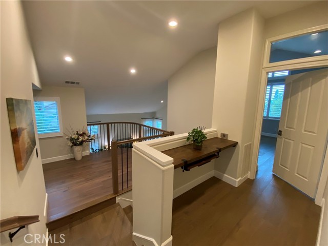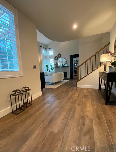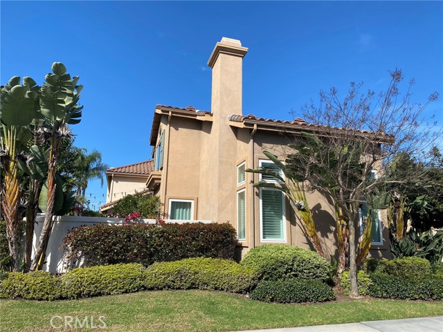 Absolutely Stunning 3-Bedroom Home with a Loft in the sought-after prestigious, gated community of Miramonte! Welcome to this pristine, beautifully upgraded residence nestled on a corner lot within the desirable Tustin Ranch Golf Course neighborhood. This exceptional home, lovingly cared for by its owners, blends charm, functionality, and showcases tons of upgrades, including the addition of a spacious loft, recessed lighting, newer windows and doors, premium wood flooring on the upper level. Step into the elegant living/family room featuring soaring vaulted ceilings, expansive windows with custom coverings, luxury tile flooring, high-end built-in Thermador wine cooler, welcoming fireplace with granite facing, raised hearth and wood mantel. The remodeled kitchen is a true centerpiece, boasting granite countertops and backsplash, a picture window above the sink offering views of the backyard, moveable granite island, lighted cabinetry with glass doors, a Bosch dishwasher, a Samsung oven, a built-in KitchenAid refrigerator, a stainless steel range hood, a cozy dining area, and a sliding panoramic door leading to a serene, private backyard—perfect for outdoor dining, entertaining, morning coffee or just simply relaxation in a fragrant tapestry of roses, azaleas, bougainvillea, and variety of fruit trees: orange, apricot, lemon, mandarin, and plum. Downstairs also features a tastefully updated powder room and a direct garage access. Ascend the custom wood and wrought-iron staircase to discover a spacious primary suite with trees view, vaulted ceilings and upgraded ensuite with dual granite vanities, a soaking tub with shower, a skylight, a motorized privacy roller screen, and a walk-in closet. Two additional bedrooms, an upgraded full guest bath, and a cozy loft complete the upper level. Additional highlights include high baseboards, plantation shutters, and new light fixtures throughout the home, smart programmable Nest Thermostat, a two-car attached garage with an epoxy flooring, lots of storage cabinets, and a wall garage door opener. Ideally situated just steps from the neighborhood resort-style pool & spa, and near award winning schools, Tustin Market Place for shopping, dining, entertainment, well-known Tustin Sports Park, and freeways, this exceptional home combines comfort, class and sophistication with a prime location. A must see! You will not be disappointed!