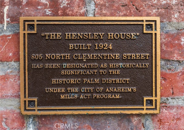 Historic "Hensley House" Craftsman with Detached ADU & Mills Act Savings Own a piece of Anaheim history! The Hensley House (1924) is a stunning example of Craftsman architecture in the coveted Palm District. The expansive front porch and custom front door lead into a grand living room featuring a rare, historic tiled fireplace flanked by original built-in bookcases. The formal dining room, complete with French door leading to the outside, flows into an oversized kitchen with a bright breakfast nook. There are plentiful cabinets in the kitchen and lots of natural light. Both bedrooms are perfectly sized with large closets. The full bath in the front house is spacious and has neutral colors. The front house is two bedrooms, one full bath and 1,216 square feet. The property includes a permitted ~288 sq ft ADU with its own electrical meter, kitchenette, full bath, and cathedral ceilings—ideal for multi-generational living or income potential. The main grounds feature a 1-car garage, large laundry room, and an additional bathroom and storage area which can be configured as home office, gym, craft room or whatever your heart desires! The landscaping is lush, your own secret garden! Complete with mature fruit trees and so private! Benefit from the existing Mills Act contract, providing substantial property tax relief in exchange for historic preservation. The property taxes on this home are only $3500 a year and with the Mills Act the new owner will inherit these monthly taxes with little to no change also no supplemental tax bill. This is a substantial savings! Perfectly situated blocks from Pearson Park, La Palma Park, and the vibrant Anaheim Packing District. Within a 15 minute stroll to over 40 restaurants, coffee shops, Farmer’s Markets and lively weekend events.