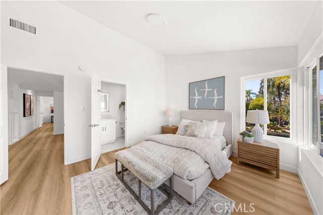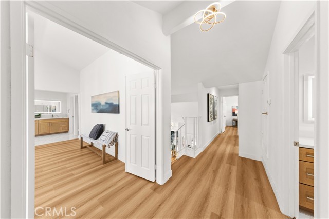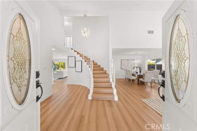 Welcome to this artistically remodeled pool home, ideally located in a mature and tranquil neighborhood of Laguna Hills. With no HOA, low property taxes, and access to the highly acclaimed Saddleback Valley School District, this home delivers the perfect blend of comfort, convenience, and value. Boasting stunning curb appeal, the exterior features flowing water fountains, a welcoming front yard sitting area, tree-lined side yard, a private driveway, and a 3-car garage. Inside, fine craftsmanship shines through every inch of this thoughtfully renovated residence. Step into a bright, open interior with soaring ceilings, newly remodeled stairways, and a seamless blend of modern design and warmth. The living room opens through brand-new French doors to the front porch, offering serene views of lush landscaping and the gentle sounds of the fountain. The formal dining room is highlighted by luxury wood-textured flooring, large sliding windows, and elegant pendant lighting. The gourmet kitchen is a chef’s dream, featuring new stainless-steel appliances, white shaker cabinets with solid wood drawers, marble-style quartz countertops and backsplash, and sleek new hardware. Enjoy effortless indoor-outdoor living as the breakfast area and family room flow directly to the backyard retreat. Perfect for multi-generational living, a guest bedroom with full bathroom is conveniently located on the main level. Upstairs, discover four additional bedrooms and three updated bathrooms, including two en-suites. The primary suite impresses with vaulted ceilings, double-pane French doors, and a private balcony offering sweeping views. The primary bath features dual vanities, a walk-in shower, and a sunlit soaking tub room for the ultimate in relaxation. Additional bathrooms are outfitted with new quartz vanities, modern walk-in showers with barn door closures, and updated lighting and ventilation. Step outside to your own private oasis—a sparkling oversized pool and spa, built-in BBQ island with fridge, generous patio space, and mature trees create the perfect backdrop for entertaining or quiet retreat. The spacious side yard includes raised garden beds, natural turf, and a peaceful reading nook. Just a short walk to community parks, Laguna Hills Plaza, Target, and only one minute from the I-5 freeway, you’ll enjoy unmatched accessibility while still relishing peaceful residential living.