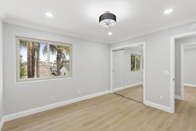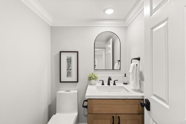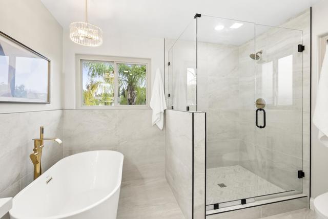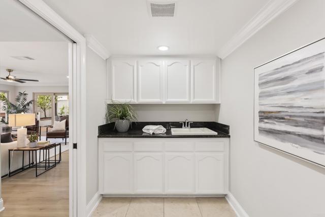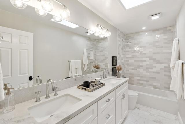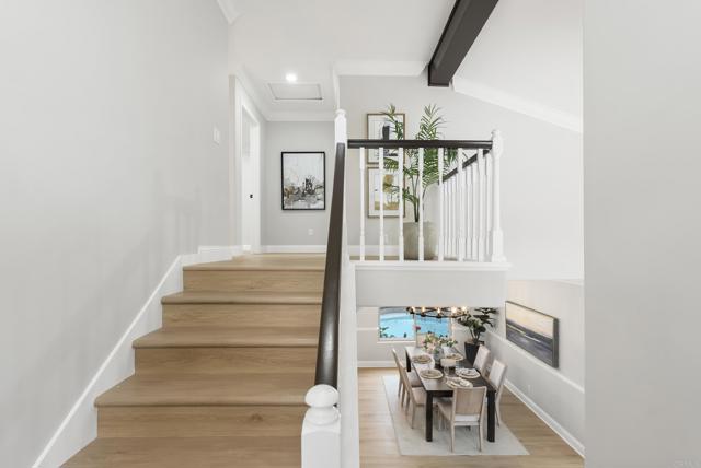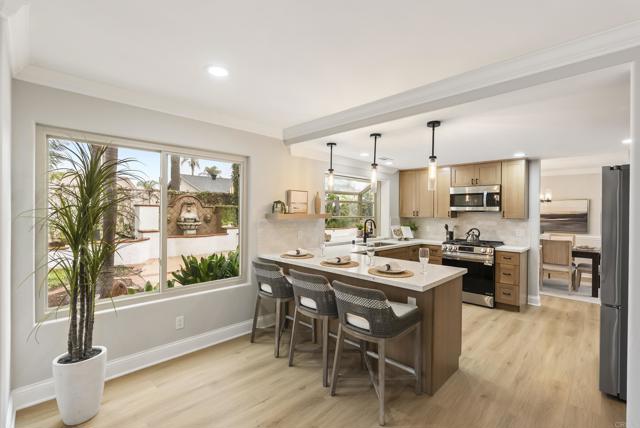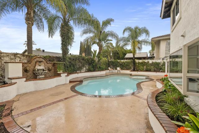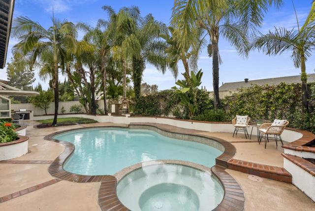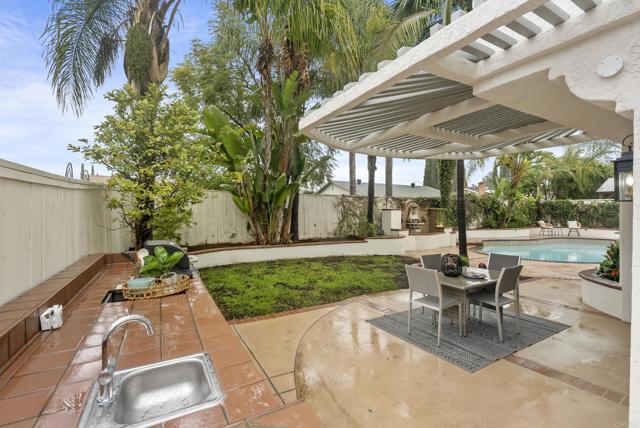 Imagine pulling up to this freshly renovated modern sanctuary on a dead end street. Through The front door you are greeted by a formal entry with dramatic vaulted ceilings open to the second floor, and abundant natural light from the transom windows. Directly next to this area are the formal living and dining rooms. The kitchen features rich white oak upper and lower cabinets complimented by white quartz counters, contrasted by matte black hardware and fixtures. Just off the kitchen is the other living room where you will find a fireplace, and access to the patio that joins to the outdoor kitchen/BBQ area and the pool area. The remainder of the yard is complete with rich vegetation and landscape making it feel like an oasis. Soak in the shade or the sun from one of two covered patios with the soft subtle sounds of the water feature. Upstairs is the ultimate owners retreat accompanied by an ensuite bathroom, walk-in closet, soaking tub, with large format tile. Just across from this home you will find Hilleary park that offers ample grass area, playgrounds, tennis courts, basketball courts, and more. Plenty of restaurants, shopping, and services a block over as well. This is elevated Poway living!