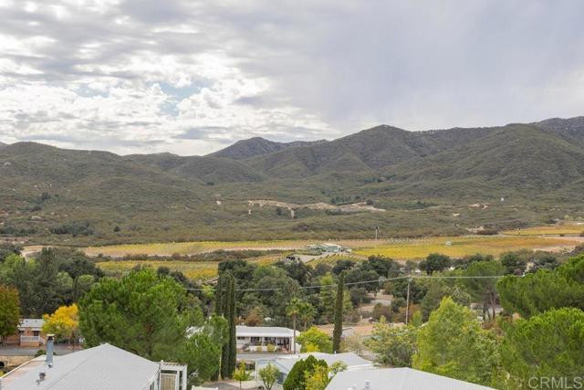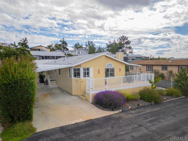 UPPER RIDGE Corner Lot - with VIEWS! Quiet cul-de-sac private oasis that abounds with natural views, of nearby hillsides and trees -to clear mountain panoramas. Located in Stone Ridge Estates - tranquil and rural, nestled in the backcountry with beautiful mountains, surrounding wilderness, foothills, mature trees, ponds (including community-owned fishing ponds for catch-and-release), and a quiet, zen-like atmosphere. Residents remark that the environment feels like a mountain village, with a laid-back, country-living vibe. Affordable Active retirement 55+ Life! This immaculate 2 bedroom/2 bath home has a fully landscaped wrap-around yard that is fenced and ideal for pets, gardening and outdoor enjoyment. The remodeled kitchen seamlessly connects to the living and dining areas, and is loaded with custom cabinets and newer appliances. Beautifully maintained, this home offers open living spaces filled with exceptional natural light. A cozy corner wood burning fireplace anchors the family room between windows that reveal mountain peaks. The primary bedroom is roomy and inviting, complete with high ceilings and an ensuite bath. The secondary bedroom and bath provide a perfect setup for guests. An office or flex room off the family room is an ideal workspace, art studio, or workout room. Laundry room next to kitchen for total ease. Step outside to a peaceful covered deck patio and outdoor area made for unwinding and enjoying morning coffee, and spectacular sunsets. Manicured gardens contain multiple mature fruit trees, and herbs among floral foliage. Attached large carport adds convenience, while a detached shed is perfect for storing bikes and extra gear. Nearby trails are legendary for hiking and biking! Stone Ridge community offers exceptional amenities, including a heated saltwater pool, jacuzzi, ping pong and billiards, clubhouse, library, laundry, and more. HOA fees are only $372, including water, cable, sewer & trash.--this is a Land Owned community--there is NO Space Rent. No better Value in Southern California!! See it today!!!