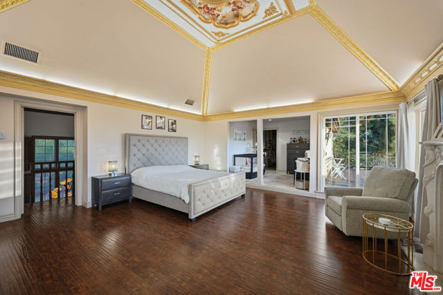 A rare, gated architectural estate bordering Brand Park, approached by a private drive that opens to a palm-lined motor court with fountain. A grand two-story entry with a curved staircase unveils refined architectural details throughout, including statement marble fireplaces, designer chandeliers, and Italian porcelain tile floors. A turreted two story private library offers private access to the primary suite, while formal living and dining rooms transition seamlessly into a dramatic great room crowned by 30-foot beamed ceilings and expansive view windows. The chef's kitchen showcases custom cabinetry, granite countertops, and an oversized island designed for entertaining. From the primary suite, jetliner views stretch across the city. The home features five bedrooms including two primary suites, plus a private two-bedroom attached guest house. Outdoors, a resort-style pool and spa, outdoor kitchen with bar seating, private yard and additional guest parking complete this secluded, legacy-caliber retreat.