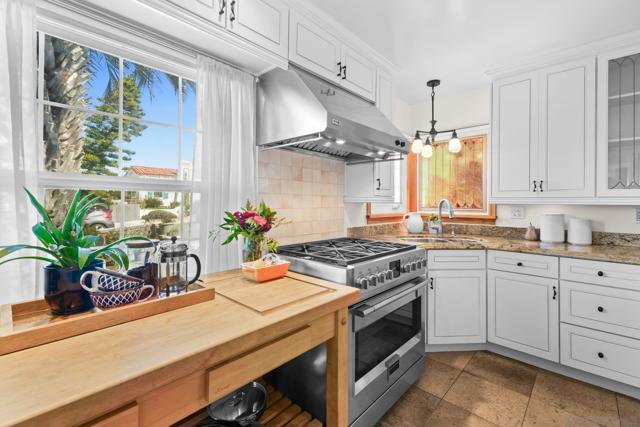 Perched at the top of the hill to capture refreshing coastal breezes and ocean views from the living room and front deck, this charming single-level Cape Cod blends timeless style with a beachy lifestyle. Warm solid Birch wood floors anchor the inviting interior, while upgraded windows and side/rear doors completed through the Quieter Home Program enhance comfort and coastal vibes. The living room is filled with natural light and showcases northern views along with glimpses of the ocean and evening twinkles toward Mission Bay. The updated kitchen is designed to impress, featuring custom stained-glass artwork, stainless appliances, amazing chopping block, and a layout that’s both functional and stylish. Dual primary suites offer flexibility, while outdoor spaces truly elevate this property. Enjoy dramatic ocean sunsets from the front deck, unwind under the awning on the rear deck, or gather with friends on the flagstone patio out back surrounded by mature landscaping that provides beauty and privacy. Completing the property is a 2-car garage and an ideal top-of-the-hill location that maximizes light, views, and coastal ambiance. A rare opportunity to own a charming Cape Cod retreat with modern upgrades in an exceptional location.