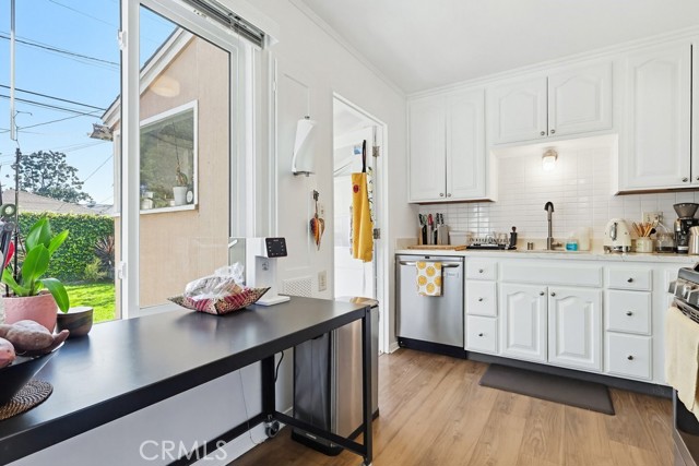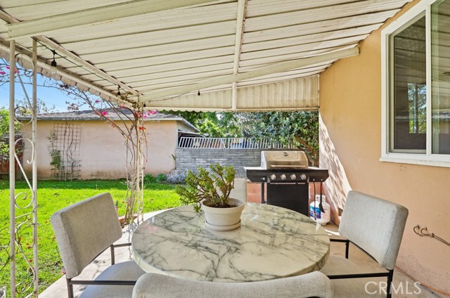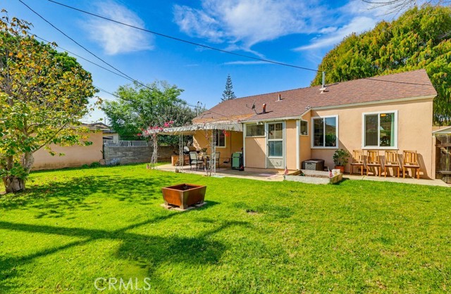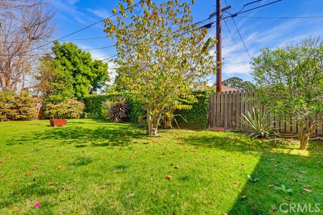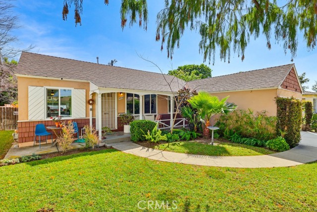 Located on a peaceful Los Angeles street, this well-maintained residence offers inviting curb appeal with a spacious front lawn, mature landscaping, and a striking oversized tree that enhances the setting. A driveway along the side leads to a two-car garage, while a gently curving walkway welcomes you to the front porch and entry. Inside, the home opens to a comfortable living room that connects seamlessly to the dining area, complete with a ceiling fan and well-placed windows that bring in natural light. The adjacent kitchen is thoughtfully designed with white cabinetry, matching countertops and backsplash, creating a bright and efficient workspace. A nearby laundry-utility room provides added convenience and direct access to the backyard. A central hallway leads to the bedroom wing. The home offers three well-proportioned rooms, including two traditional bedrooms and a third currently utilized as an office, easily adaptable to suit a variety of needs. One bedroom features built-in closet storage and a ceiling fan, while the primary bedroom includes a ceiling fan, built-in vanity, and additional cabinetry for organized storage. A full bathroom serves this area, and all bedrooms benefit from natural light through well-positioned windows. The backyard is designed for versatility and outdoor enjoyment. A covered patio with concrete flooring provides a shaded gathering space, while the surrounding grass yard extends along the side of the property, creating a generous outdoor footprint. Mature plantings and taller fencing at the rear enhance privacy and establish a comfortable, enclosed feel. With its functional layout, abundant natural light, and usable indoor and outdoor spaces, this home presents a well-rounded opportunity in a desirable Los Angeles neighborhood.