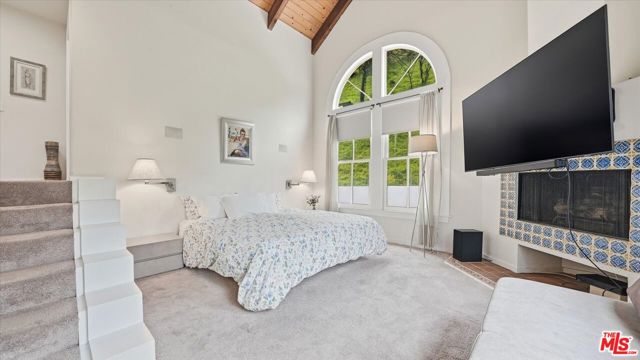 Tucked into the serene hills of BHPO just moments from Benedict Canyon, this charming Cape Cod inspired retreat offers privacy and character. Sunlight fills the open, multi-level layout, highlighting vaulted ceilings, graceful arches, and thoughtful architectural details throughout. A blend of Spanish warmth and classic design is showcased through Saltillo tile floors, exposed wood beams, and timeless finishes. The home spans approximately 2,309 square feet and features two bedrooms plus a versatile den or office that can easily serve as a third bedroom, along with two bathrooms and a loft-style living room anchored by a cozy fireplace. The kitchen is equipped with stainless steel appliances and a center island, flowing seamlessly into the dining area. French doors open to a spacious, private patio - an ideal setting for entertaining or unwinding under the stars. The primary suite occupies the entire upper level, offering a romantic escape with a fireplace, vaulted beamed ceilings, arched windows, and peaceful treetop views. A cedar-lined walk-in closet and a spa-like bathroom featuring custom cabinetry and slate finishes complete the experience. An enclosed private two-car garage provides secure parking and added convenience. A peaceful hillside sanctuary just minutes from the heart of Beverly Hills.