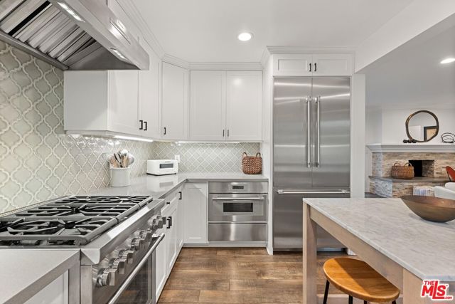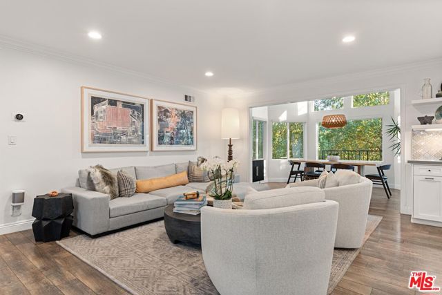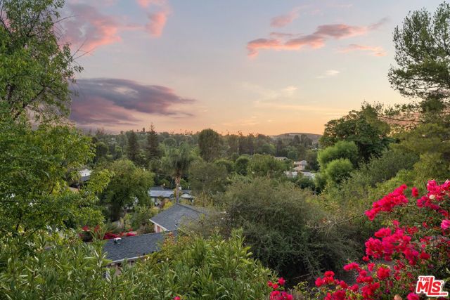 Step into this Woodland Hills sanctuary, a beautifully updated single-story home tucked away on a quiet street south of the boulevard. Set behind a private,180-foot gated driveway, this 3BD/2.5BA home blends comfort and style with treetop views, a resort-inspired pool, and effortless indoor-outdoor living. Inside, engineered hardwood floors and a stone-accented fireplace set a welcoming tone in the light-filled living room, where glass doors open to a view deck, perfect for morning coffee or sunset entertaining. A chic powder bath sits just off the entryway for guests. The open-concept kitchen features premium Thermador appliances, an island, and abundant cabinetry and counter space. The kitchen seamlessly connects to the family area, complete with its own gas fireplace, and to the formal dining room, where beamed ceilings and expansive windows frame the surrounding greenery. Offering a peaceful retreat, the spacious primary includes dual closets, a split A/C system, direct backyard access, and a luxurious ensuite bath with a dual vanity and step-in shower. Down the hall, two additional bedrooms share a beautifully appointed bath with generous counter space and shower-tub combo. Outdoor living shines here. Host unforgettable gatherings by the resort-style saltwater pool, equipped with brand new systems, or dining al fresco under the stars. Hillside vistas create a private oasis framed by lush landscaping. Ideally located near Wilbur Charter Elementary, scenic trails, and shops and restaurants along Ventura Boulevard, this home delivers the perfect blend of sophistication, seclusion, and everyday ease.