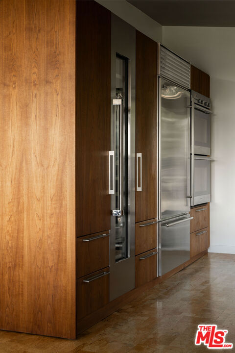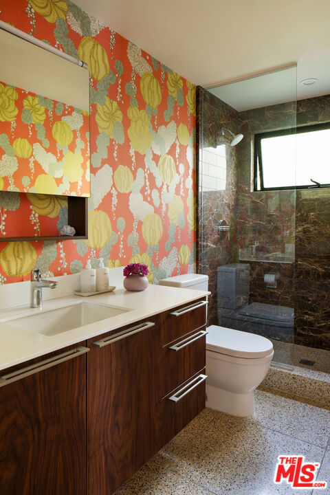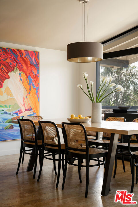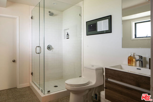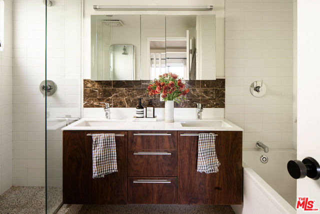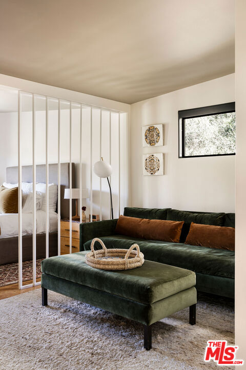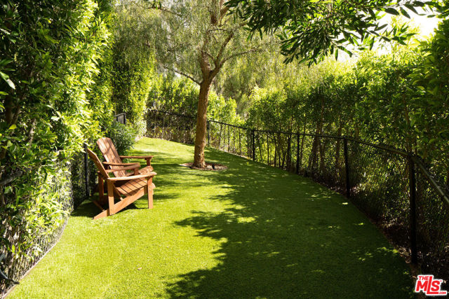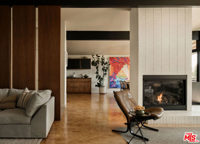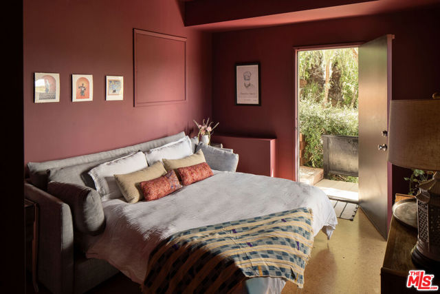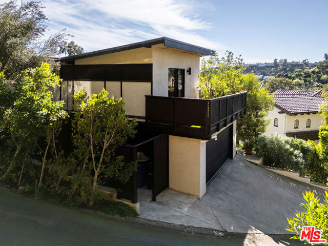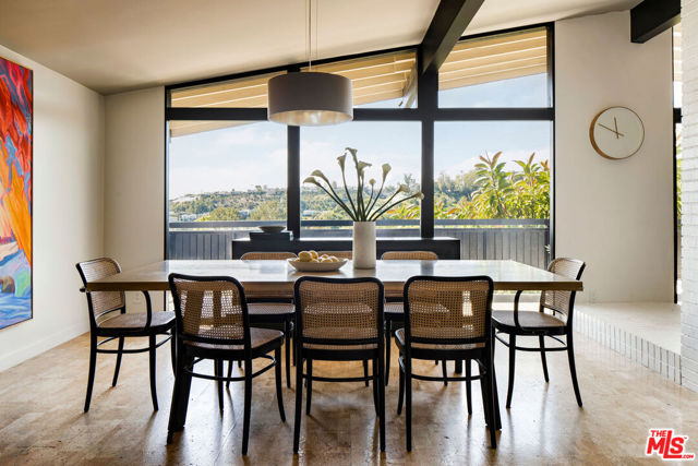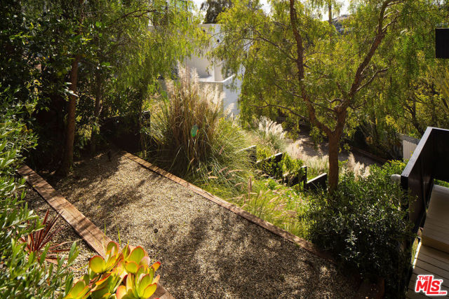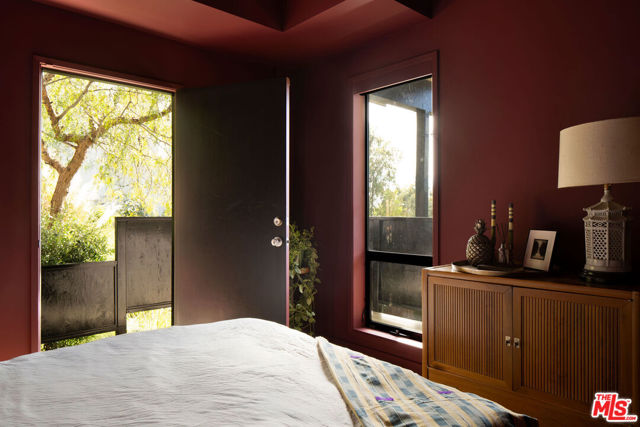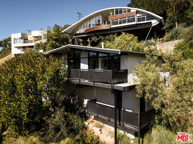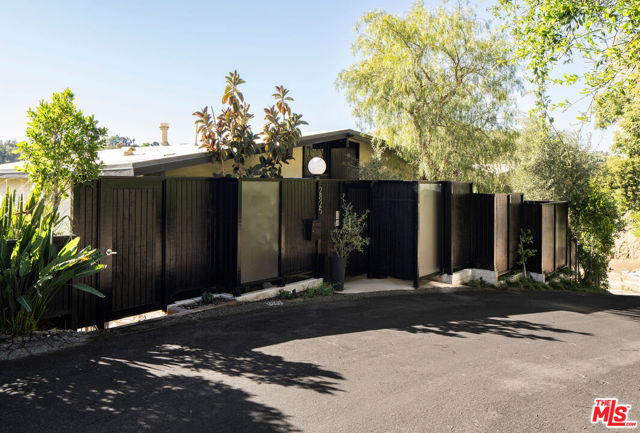 Located in Nichols Canyon with breathtaking hillside views, this 1960 post and beam home has been expertly renovated and restored by Chris Salay, and sits on a fully gated and fenced corner lot, landscaped to perfection. The home features 3 bedrooms, 2 full bathrooms, a detached lower studio with its own full bathroom, and 510 square feet of finished storage space. Set just below the iconic Lautner Garcia House, the home's architectural elements include dramatic pitched ceilings, imported cork flooring, terrazzo-tiled bathrooms, custom-built-ins throughout, and floor-to-ceiling windows in the main living space that frame wide mountain vistas. Private, serene, and impeccably designed, the home offers idyllic canyon living. Beyond the secure front gate, the home opens to reveal its classic post and beam structure on full display. Striking vaulted ceilings and floor-to-ceiling windows with windowed doors lead to a long upper deck with unobstructed, panoramic hillside views. A center brick fireplace anchors the main living space, separating the dining area from the formal living room. The living room and adjacent den offer separate areas for hosting and relaxation, both with custom built-in shelving. The kitchen features custom-built dark wood cabinetry that complements the home's architectural style. The top-of-the-line appliance suite includes a Sub-Zero refrigerator, a Thermador beverage column, Bosch dishwasher, and a Dacor gas range. Three bedrooms and two full bathrooms are situated down the hallway. The primary suite feels like its own wing, complete with a sitting area, custom fluted-wood built-ins, and sliding doors that open to a private deck with hillside views and a coveted peek at the Garcia House. The ensuite bath layers imported terrazzo flooring with Rosso marble tile, dual sinks, a soaking tub, and a shower. Two additional bedrooms share a bathroom finished with imported terrazzo floors, marble tile, Walnut wallpaper, and a custom wood vanity - equal parts playful and polished. Downstairs, a fully detached, oxblood-drenched studio - the paint color selected by AD100 interior designer Jake Arnold - features imported cork flooring and its own bathroom, offering a versatile space as guest quarters, office, gym, or screening room. An adjacent expansive storage area adds an exceptional amount of storage rarely found in homes in this area. The terraced, street-to-street lot, landscaped by Andrea Scharff, unfolds with citrus trees, a fully fenced yard, walking paths, and a large grassy area for recreation and play. An attached two-car garage with EV charger completes the lower level. Upgrades include Nest thermostats, a newer Miele washer and dryer, an ultra-pure alkaline drinking water system, custom Mod Barn built-in cabinetry and closets, Nest security cameras, Aiphone video intercom, reinforced balcony support, and newly installed landscape lighting - thoughtful enhancements that support the architecture without distracting from it. Just moments from Runyon Canyon and minutes to Hollywood, West Hollywood, and Studio City, this gated mid-century retreat offers privacy, provenance, and that unparalleled Nichols Canyon ease of living - a true refuge in the heart of Los Angeles.