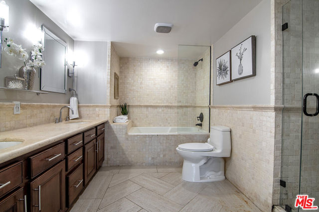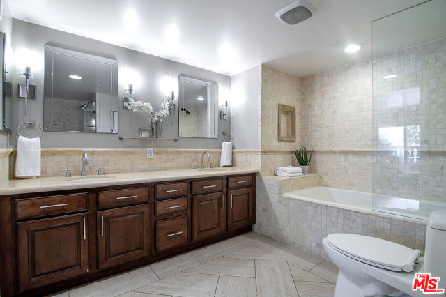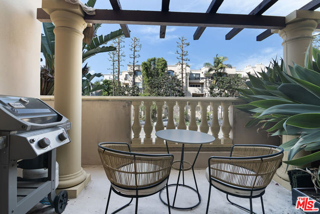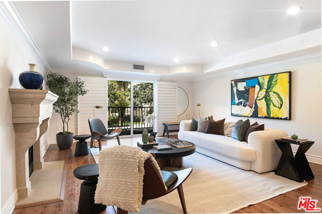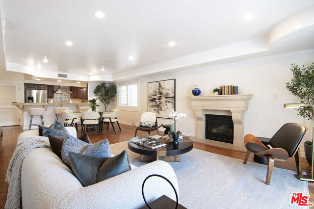 Perched high above the street in a fantastic location next to Century City, this beautiful and spacious condo is in a Mediterranean-style complex built in 2008. This light-filled home features rich hardwood floors, recessed lighting, and an open floor plan outstanding for both living and entertaining. The chef's kitchen is appointed with granite countertops, stainless steel appliances, and a Viking oven and range. It is open to a large dining area and a living room anchored by an elegant gas fireplace. Plantation shutters and two private balconies add charm and provide great indoor-outdoor flow. Both bedrooms are thoughtfully positioned away from the main living spaces for added privacy and feature their own ensuite bathrooms. The spacious primary suite includes a large walk-in closet, private balcony, and a beautifully appointed bathroom with dual sink vanity, natural stone finishes, shower and soaking tub. The second bedroom is well-sized with its own full bath. The powder room is just off the entry and is beautifully designed. Additional highlights include in-unit laundry, two tandem underground parking spaces, and guest parking. Dining and shopping in Century City is just minutes away. The location is very close to UCLA, Beverly Hills, and world class beaches of Santa Monica and Malibu.