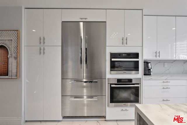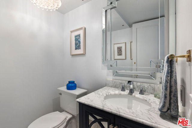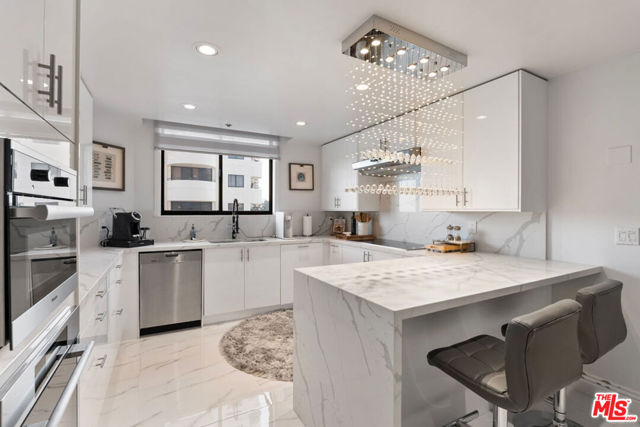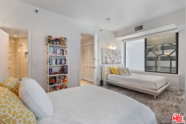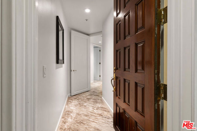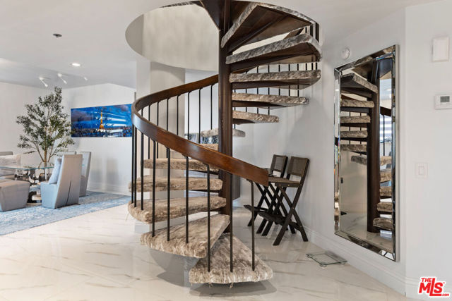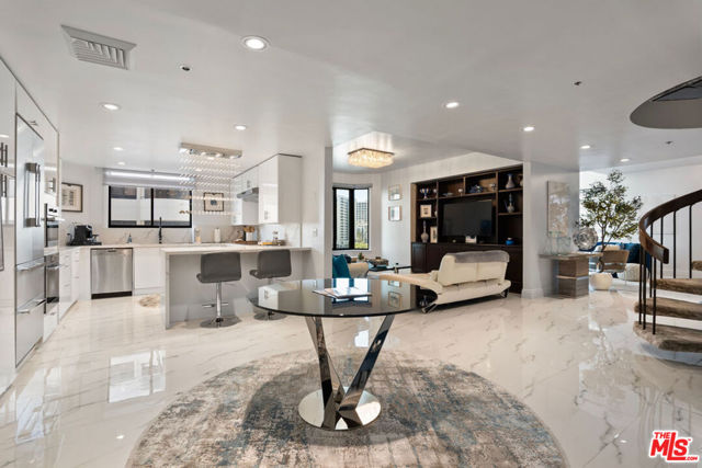 Welcome to The Wilshire Thayer, where refined luxury meets architectural distinction. This northwest-facing corner residence commands sweeping street and city views and offers an exceptional two-story layout encompassing approximately 2,146 square feet, with 2 bedrooms and 2.5 bathrooms. A formal entry introduces an expansive open-concept living and dining area, thoughtfully designed for both grand entertaining and everyday comfort. A contemporary fireplace anchors the space, while floor-to-ceiling glass walls frame the cityscape and open to a private balcony, seamlessly blending indoor and outdoor living. The gourmet kitchen is impeccably appointed with Carrara marble countertops, custom cabinetry, a generous breakfast bar, and premium Miele appliances. A well-proportioned den and an elegantly designed powder room complete the main level, which is unified by sleek porcelain tile flooring throughout. A dramatic spiral staircase leads to the upper level, where the primary suite serves as a tranquil retreat. This spacious sanctuary features its own fireplace, serene views, a walk-in closet with built-in safe, and custom cabinetry for ample storage. The spa-inspired primary bath offers a soaking tub, separate glass-enclosed shower, dual vanities, and a thoughtfully integrated dry bar with refrigerator. The junior suite enjoys a private full bath and overlooks the living area below through striking New York loft-style glass, creating a bold architectural statement. Plush carpeting, a discreet laundry closet, and a secondary private entrance enhance the comfort and functionality of the upper level. Ideally situated just moments from Beverly Hills, Century City, Westwood Village, UCLA, and nearby places of worship, this distinguished residence offers a rare combination of sophisticated design, premier location, and effortless convenience.