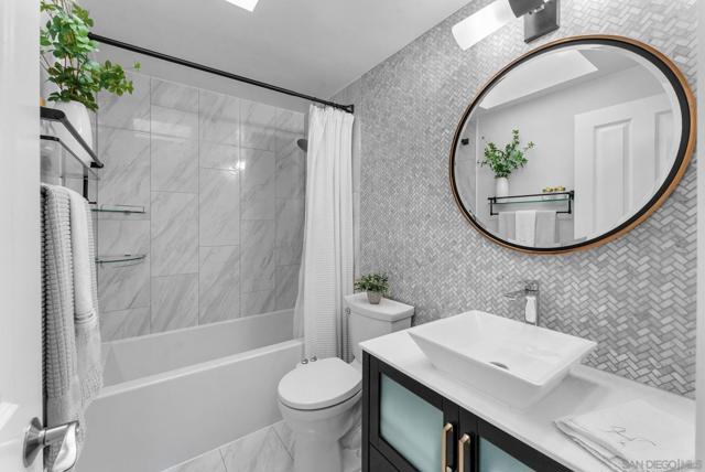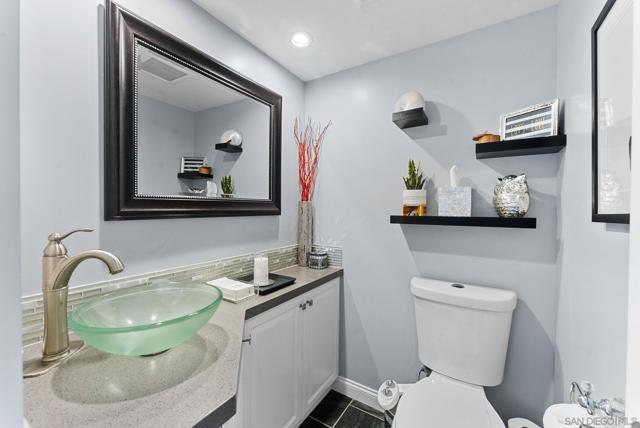 Beautifully refreshed home situated on a quiet cul-de-sac in Poway, offering thoughtful upgrades, comfortable living spaces, and a spacious backyard. Recent improvements include freshly painted interior and exterior, new carpeting upstairs, refinished kitchen cabinetry, and a remodeled bathroom featuring a modern vessel sink and updated fixtures. Inside, the home offers bright and inviting living spaces with a functional layout that flows easily between the kitchen, dining, and living areas. The kitchen features refinished white cabinetry, stainless steel appliances, and a skylight that brings in natural light while maintaining excellent everyday functionality. Upstairs, the new carpeting adds comfort to the bedroom spaces, while updated stair finishes and railings provide a clean, modern touch. The remodeled bathroom offers a stylish vanity with glass vessel sink, contemporary lighting, and updated finishes. Outside, the property features a large, usable backyard with plenty of room for outdoor dining, entertaining, gardening, or future possibilities such as a pool or expanded outdoor living space. Located in a desirable Poway neighborhood with scenic surroundings and nearby parks, this home presents a move-in-ready opportunity with meaningful upgrades and great outdoor space.