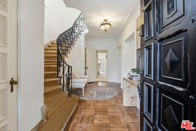 Spanish Colonial charm meets thoughtful modern updates in this beautifully remodeled 1930 residence. Rich in character, the home showcases preserved original details including original beams, elegant windows, French doors, a striking spiral staircase adorned with wrought-iron railing, and gracious landing. The main residence features a classic and functional floor plan with 3 bedrooms, 2.5 bathrooms, plus den, an office/nursery, small reading room, and ADU. The expansive living room with beamed ceilings, stately fireplace, hardwood floors, and natural light flowing in from the abundance of window flows seamlessly into the beautifully enlarged formal dining room, highlighted by rich wood detailing, providing an ideal setting for gatherings. The large and updated kosher kitchen offers modern convenience while maintaining the home's timeless appeal appointed with top of the line appliances, dining area, large functional island with breakfast bar and direct access to the outdoor dining. Adjacent to the kitchen, enjoy the comfortable den with French doors to the backyard. Upstairs features the spacious primary suite - a true retreat, with French doors to capture west facing natural light and fresh air, 2 walk-in closets, private deck, and en-suite bathroom with double sinks. 2 additional generous bedrooms with Jack & Jill bathroom, an office/bonus room with balcony, and small reading room complete the upstairs. The backyard features a private shaded entertaining area for dining with built-in Viking BBQ and kitchenette, sparkling pool and spa - perfect for entertaining or quiet relaxation. Adding exceptional versatility and value, the ADU offers additional opportunities for the new owners needs with 1 bedroom, 1 Bathroom, sitting area, and kitchen. This prime location is a rare find, blending historic character with modern comfort.