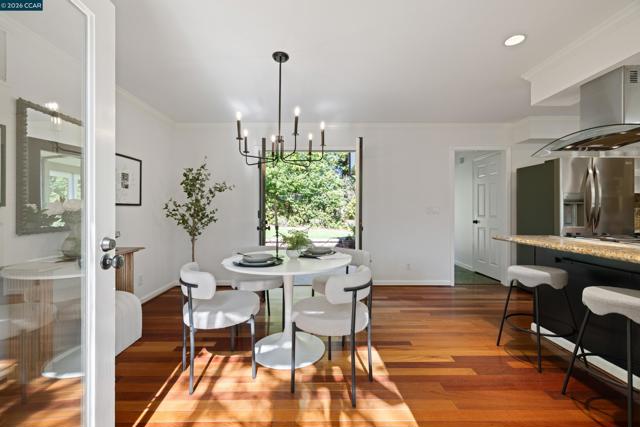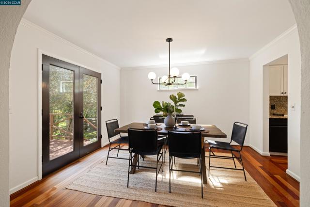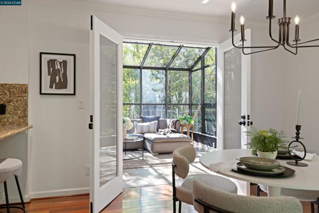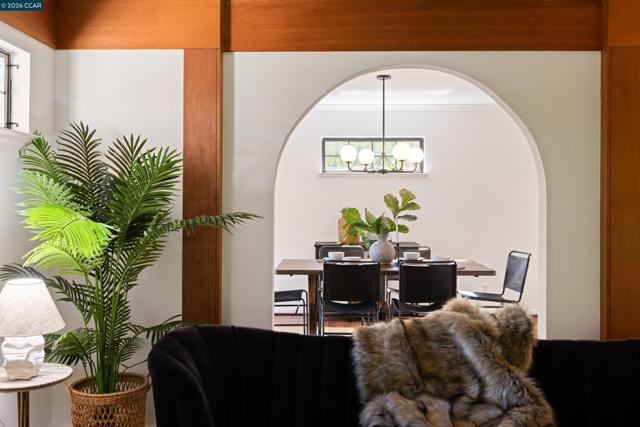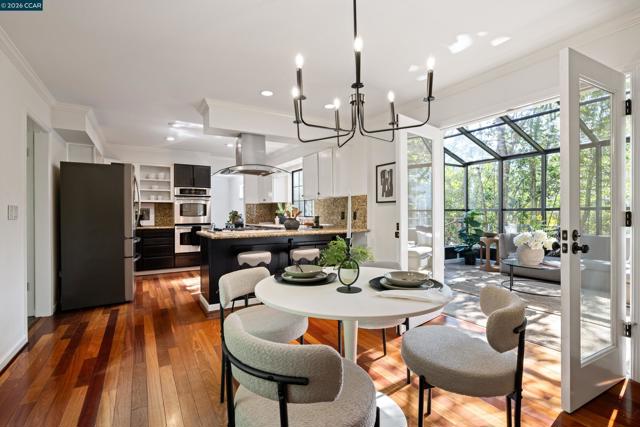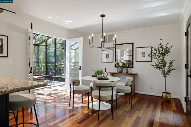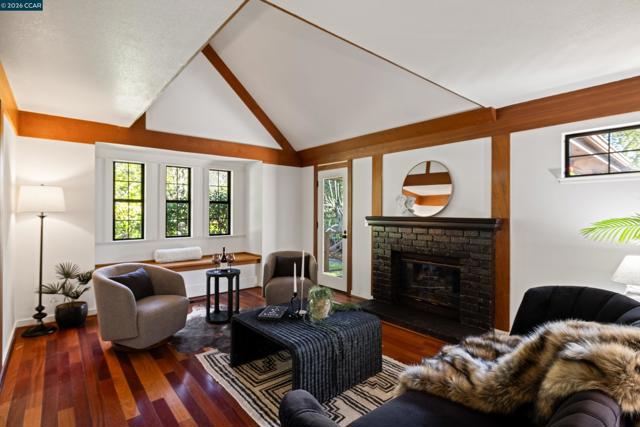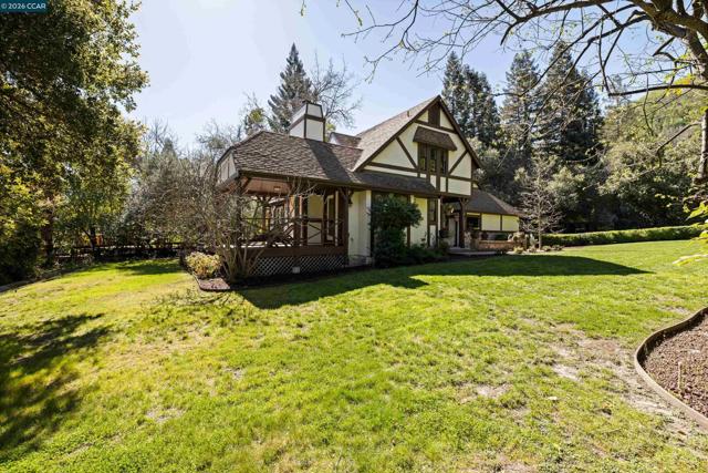 Tucked behind a private gate on flat & beautifully manicured .52-acre lot on the much-coveted West side of Alamo, this 2,089 sq ft English Tudor estate captures rare sense of romance, privacy & architectural distinction. Steeply pitched gables, classic half-timber detailing & charming lines create an enduring & timeless look that feels as if it was lifted from the pages of a storybook. Home offers 3 beds, 2.5 baths & bonus sunroom ideal for morning coffee, creating an indoor garden or a simple family retreat. Inside, exposed beams & angled passages frame the light-filled interior, enhanced by custom designer paint throughout. Modern lighting & updated fixtures provide a sophisticated contrast to the home's heritage architecture, blending old-world character with curated contemporary refinement. Eat-in kitchen features striking tuxedo cabinetry, convenient breakfast bar, granite countertops, stainless steel appliances, double oven, gas range & generous pantry. Formal dining room opens through French doors to a private rear patio, allowing for seamless indoor-outdoor entertaining. Living room boasts vaulted ceilings, inviting window seat & gas burning fireplace, balancing architectural drama w/ inviting comfort. Primary bedroom w/ hardwood flooring & windows overlooking front yard.