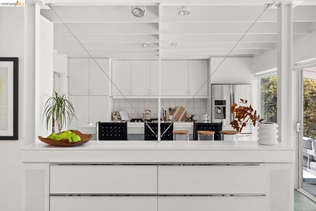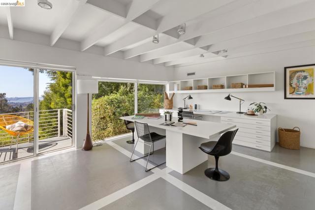 Panoramic Golden Gate views from this extraordinary modernist residence - clean geometric lines, refined minimalism, and dramatic use of light with expansive floor-to-ceiling windows and glass doors that create seamless indoor-outdoor flow to a large view deck. The open floor plan is centered around a tranquil courtyard - then enter via dramatic two-story living + dining area. 3BRs/2BA on main level, with upper gallery-style family room and office that connects to the private primary suite with sweeping western views. Central heating/cooling, newer systems. A large full-height basement offers huge flexible space for studio, workshop, music and wine storage. Gated entry, wide driveway, and detached two-car garage provide ample off-street parking. Designed by noted modernist architect Don Hisaka, whose work is recognized for its bold geometry, minimalist elegance, and masterful use of light. Sited on a large private lot with its own oak grove in the desirable Lower Claremont Hills, this remarkable property offers serenity, architectural pedigree, and convenient access to nearby shops, dining, and transportation. BESO Score 4 Views: Downtown