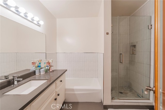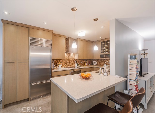 Live in this modern, upgraded and oversized 1 bedroom, 1 1/2 bathroom condo located only a few blocks from the beach, bike path, restaurants and shops. The European-style kitchen remodel is a chefs dream with terrazzo counter tops, Sub-Zero refrigerator, Miele electric range, Gaggenau convection oven, Bosch dishwasher, custom cabinets with thoughtful built-in features and recessed lighting. The condo's main living, kitchen and dining areas have polished concrete floors and double-paned sliding glass doors that take you out to the oversized balcony, perfect for your morning coffee and entertaining friends. This ground floor unit is quiet with double paned windows throughout and only one shared common wall. Bamboo flooring covers the hallway, the huge bedroom and walk-in closet floor. The primary bathroom is spacious and remodeled featuring a full bath and a separate shower, new quartz countertop and tile floor. The rare extra half bathroom has stone flooring and is perfect for guests. The well-maintained mid-century era 32-unit condo building offers a shared rooftop sundeck with ocean and mountain views. The condo also comes with a storage locker and assigned parking in the gated subterranean parking garage. It is one of the only units in the building with a pre-installed 240v outlet ready for EV charging. Water and trash are included in the low monthly HOA dues.