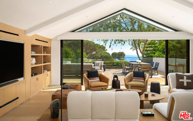 Privately set within a gated coastal enclave, 28022 Sea Lane presents a striking modern retreat where refined design meets effortless coastal living. Thoughtfully composed interiors and beautifully landscaped grounds create a sense of calm and privacy from the moment of arrival.Mature hedging and lush landscaping frame the approach to the home, where stone pathways lead to a reclaimed wood pivot entry door. Multiple outdoor lounge areas, fire pits, and water features create a layered outdoor environment designed for both relaxation and entertaining. Inside, wide plank wood floors and clean architectural lines establish a warm, understated palette. Custom Fleetwood doors and windows allow natural light to move throughout the home while creating a seamless connection to surrounding terraces and gardens. The main living areas unfold in an open, light filled layout where the living room, dining area, and chef's kitchen flow together with ease. A sleek fireplace anchors the living room while expansive sliding glass doors open directly to the outdoor entertaining areas. At the center of the home, the kitchen features a dramatic waterfall island and generous preparation space. Surfaces throughout the kitchen and wet bar are finished in Consentino carbon neutral ultracompact porcelain, complemented by custom millwork by Western Built and handcrafted Heath tile. The kitchen is equipped with Wolf appliances including induction cooking, oven, and microwave. Bedrooms are designed as quiet private retreats, while the bathrooms feature spa inspired finishes with clean lined stone surfaces and carefully integrated lighting.The primary suite offers vaulted ceilings, custom built ins, and sliding doors that open to a private terrace overlooking the landscaped grounds and pool. The suite continues into a large custom closet and dressing area with built-in storage, along with a skylit bathroom featuring dual vanities, a spacious shower with multiple shower heads and bench seating, and a separate water closet with bidet. Materials throughout the residence include Nakamoto Forestry Shou Sugi Ban wood detailing, adding depth and texture to the home's architectural palette. Outdoor living centers around a resort style pool and spa surrounded by landscaped gardens, sun decks, and lounge areas. A covered outdoor fitness area provides space for training, while the outdoor kitchen and dining terrace feature stone counters, built-in grilling, refrigeration drawers, and a Forno Venetzia pizza oven. An outdoor entertainment area includes a SunBrite television and integrated sound.One of the most distinctive features of the property is the private tennis court shared with only one neighboring residence. Adjacent to the court is an additional parcel of land that is solely owned and includes power, water, and a potting shed, offering an ideal setting for a cutting or vegetable garden. Private stairs nearby descend through coastal greenery to the beach, providing a direct connection to the sand and ocean.Modern systems throughout the home include Lutron lighting controls, Sonos audio throughout the residence, and integrated smart home technology. 28022 Sea Lane blends thoughtful architecture, refined materials, and beautifully designed outdoor spaces to create a sophisticated Malibu retreat designed for both entertaining and everyday living.