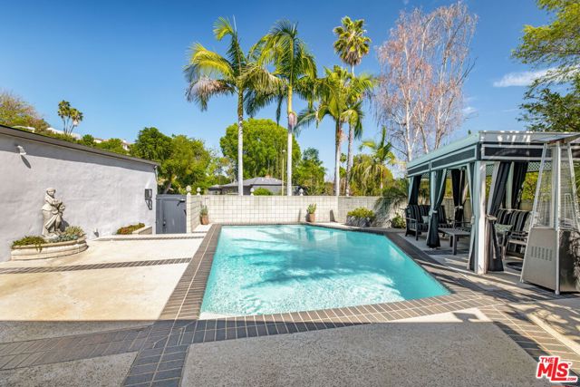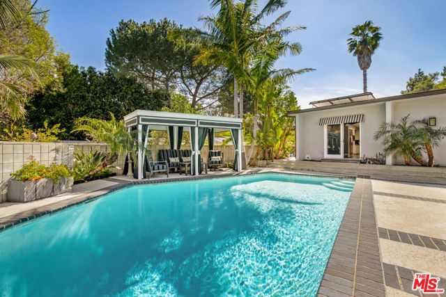 Experience the timeless allure of Mid-Century Modern design in this spectacular residence located in the coveted Royal Oaks enclave of Encino. Set in an idyllic, resort-like setting, the home blends architectural style with effortless California indoor-outdoor living. This exceptional retreat offers 3 bedrooms, 3.5 bathrooms, a dedicated office with direct access to the backyard, and a versatile bonus room off the pool with its own private entrance, ideal for guests, a studio, or gym. The beautifully appointed kitchen features Sub-Zero refrigeration, quartz countertops, and Miele double ovens, combining sleek design with top-tier functionality. Step outside to discover two expansive and private outdoor living spaces designed for entertaining and relaxation. Lounge beside the sparkling pool, unwind in the cabana, host elegant poolside gatherings, or dine alfresco beneath the stars in a setting that perfectly captures the spirit of California living. Modern comforts abound with security cameras, solar power, an advanced air-scrubber system, and water-conserving turf, offering both efficiency and peace of mind. Ideally located just moments from the Valley and Westside's premier shopping, dining, and entertainment, this home presents a rare opportunity to embrace a truly elevated lifestyle.