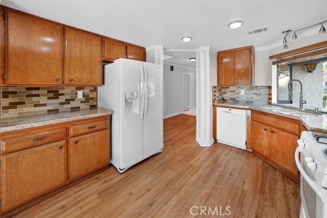 A TOUCH OF CLASS comes with this special property that gives that warm home feeling. Located in the Gated community of Scenic Hills, a best keep secret in the Santa Clarita area. This move-in-ready One Story is an end unit with no steps inside, only 1 attached wall. It pleasantly presents 2 Bedrooms & 2 full Baths, plus an enclosed patio-yard for entertaining. Special features include crown molding, wood trim, retractable ceiling fans, upgraded lighting, wood blinds, fresh paint. Upon stepping into the entry area with a wood floor & a convenient coat closet you are presented to a nice floor plan. The Kitchen has upgraded Granite Countertops, newer wood flooring, plenty of refurbished cabinetry and upgraded dual pane sliding doors to the outdoor patio area making entertaining easy. Appliances include the refrigerator, gas range, dishwasher & disposal, plus a modern dual graphite sink with an upgraded faucet. The dining area is a step away with extra cabinetry for storage convenience. Located in the Living Room is a Cozy Gas Fireplace upgraded with deco Tiled touches and a newer insert. French doors that lead to the outdoor patio from the Living Room gives an open & bright feeling. Both baths are remodeled with beautiful Deco tile touches & modern Vanities/sinks. In the Hall Bath, a highlight is the Jacuzzi Tub. The master bath has a walk-in shower. The master bedroom includes a walk-in closet with gorgeous built-in organizers, and a view out the window. A side by side 2 car finished garage has direct entry into the home & includes a garage door opener and epoxy floor protectant. You will also find Many Resort-like amenities which include a Clubhouse, a private 9-hole golf course, a large pool, indoor hot tub, sauna, billiard room, library area, gym room, & meeting room with kitchenette. Outdoor enthusiast will like the Barbecue/picnic area, Tennis Ct, Sports /Basketball Ct. Easy access to the 14 Freeway plus shopping, & a Costco is minutes close. Included in the HOA Dues is Earthquake Insurance, roof repair and common grounds maintenance. No Mello Roos. Schedule your private showing now, because this property won't last long on the market.