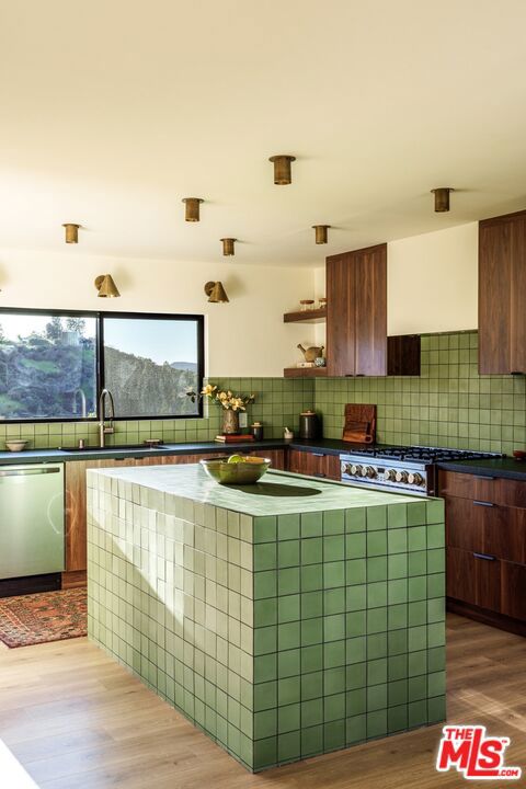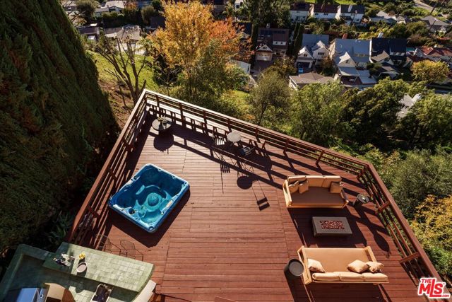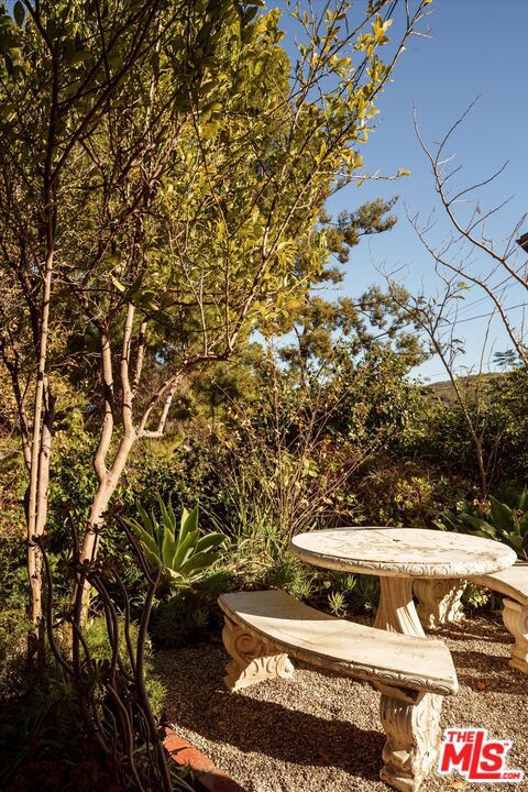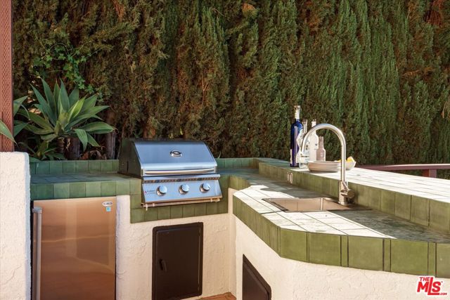 Secluded hilltop Spanish home by Decente Designs with panoramic views and great natural light. Complete with greenery, large decks, built-in BBQ, spa, exceptional privacy, the designer reimagined home features thoughtful and stylish touches throughout. New flooring, bespoke light fixtures and hardware, new Milgard windows and sliding glass doors, and an assortment of beautiful tiles adorn this one of a kind home. The kitchen has leathered granite countertops, walnut cabinetry, bronze hardware, leaf tile backsplash, brass light fixtures, all new appliances, accented by open shelving, breakfast nook and adjacent lounge area surrounded by mountain to hills views. On the other side of the home a classic Spanish step down living room lit by wall sconces and a tiled double sided wood burning fireplace. The second fireplace is in the formal dining room with a large sliding glass window with green and hillside views. Upstairs the large primary bedroom suite features its own balcony with mountain and tree views, walk-in closet, and an en suite bathroom clad in limestone, cement, and walnut. Three additional guest bedrooms upstairs and guest bathroom with double vanity, soaking tub, and unlacquered brass hardware are complemented by a built-in reading nook at the top of the staircase framed by a large window and skylight. Dining and lounging deck off of the kitchen, and an additional den space off the larger entertaining deck below with a built-in BBQ and hot tub all in complete privacy with 180 degree deep views of the surrounding green hillsides. Gardens areas below, and additional green spaces and gardens flank both sides of the house. Direct entry two car garage and just a short drive to markets, restaurants, coffee shops, hikes, and more at the bottom of the hill. A stunning Hollywood Hills home south of the boulevard in Woodland Hills.