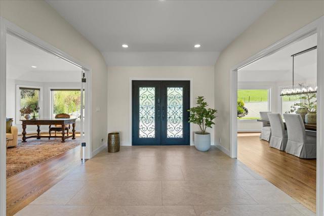 Nestled on 10 private acres, this exceptional estate offers sweeping valley and city-light views from Gilroy to Morgan Hill, AND, it backs up to the pristine hills of the Harvey Bear County Park. The property includes a 4498 sq ft mostly single-level main home and a detached 996 sq ft guest home, providing outstanding flexibility. The serene grounds feature mature olive trees, meandering gold fine paths, scenic look out areas and a tranquil pond. The main residence features a view focused great room, home office with fireplace, music room and exercise room with steam shower. The kitchen has been beautifully remodeled and has deck access for your morning coffee. The luxurious primary suite with fireplace has also been remodeled, with a sumptuous bath with free standing tub, double shower, walk-in closet, and deck access. The home is complemented by new LED lighting, new light fixtures and gleaming hardwood floors. An expansive deck is ideal for entertaining and relaxing in the spa. The view oriented guest home offers an open living space and kitchen, lovely bedroom and bath, and views from a private deck- an elegant, retreat in a truly special setting. GPS not accurate!! Follow directions listed- New Ave to Roop, then turn left onto Estates, right onto Via del Cielo