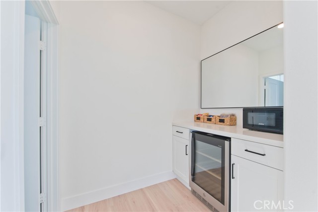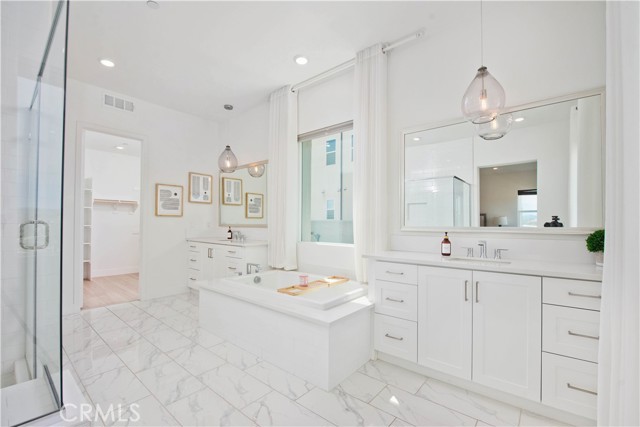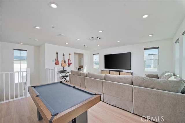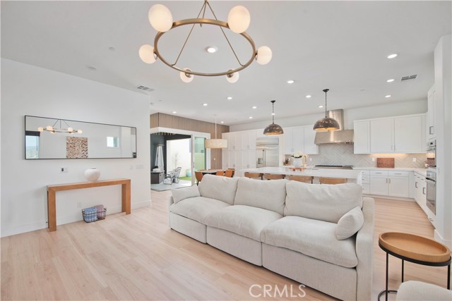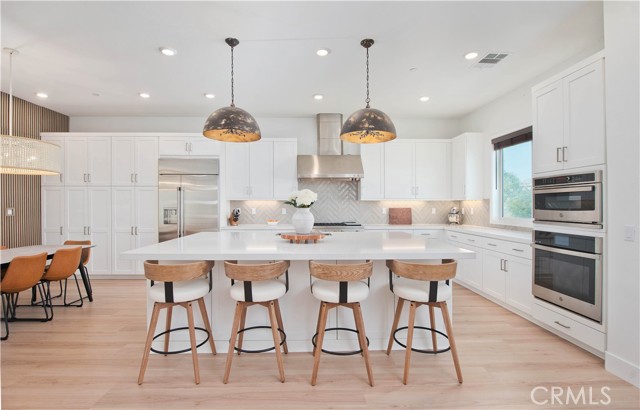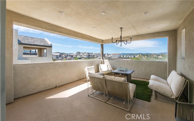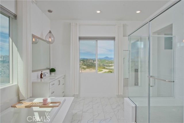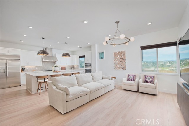 Welcome to this stunning modern detached home in the Rosemist community of FivePoint Valencia. Situated on a prime corner lot, this expansive 5-bedroom, 4.5-bathroom, three-story residence offers over 3,300 square feet of thoughtfully designed living space with scenic mountain views. Upon entry, you’re greeted by a bright open-concept floor plan featuring sleek laminate flooring throughout and stylish designer light fixtures that create a clean, contemporary feel. The gourmet kitchen features a large center island with bar seating, sleek upgraded countertops with a herringbone backsplash, abundant storage, and stainless steel appliances including a professional-grade 6-burner cooktop with griddle, range hood, and built-in refrigerator. The kitchen opens to the living and dining areas, perfect for both everyday living and entertaining. The first level includes a convenient bedroom and full bathroom with updated fixtures and a Mid-Century modern vanity, ideal for guests or multi-generational living. On the second level, the spacious primary suite offers two closets including a walk-in closet, and an en-suite bathroom with dual vanities and a separate shower and bathtub. The second floor also features three additional bedrooms, including one with its own en-suite bathroom, another full bath, and a laundry room with plenty of storage. The third floor features an expansive bonus room complete with a connecting dry bar and powder room, offering a versatile space ideal for a home office, gym, or media room. Sliding doors open to a covered deck with sweeping mountain views. Designed for indoor-outdoor living, expansive corner sliding doors open to the California Room, seamlessly connecting to the backyard with low-maintenance artificial turf. Additional highlights include an attached 2-car garage with extra storage, direct home access, and two EV chargers, plus solar panels and a backup battery system. Enjoy the community’s impressive recreation areas. Just across the way is Confluence Park, an HOA recreational area featuring swimming pools, a spa and splash zone, lounge areas, a clubhouse, a park, and more. In addition, the community offers a community garden, pump track, and miles of scenic trails for residents to enjoy. Conveniently located minutes from Valencia Town Center, Six Flags Magic Mountain, shopping, dining, parks, and hiking and biking trails, with easy freeway access.
