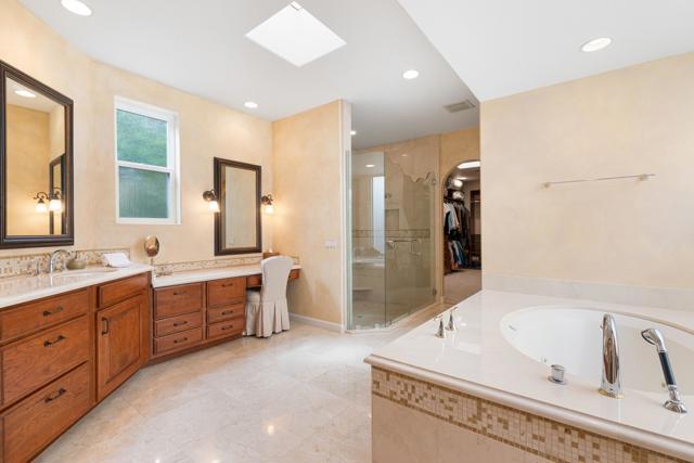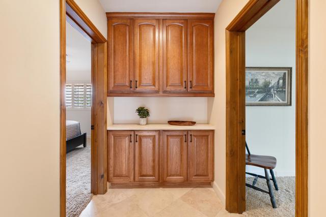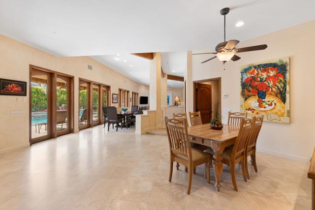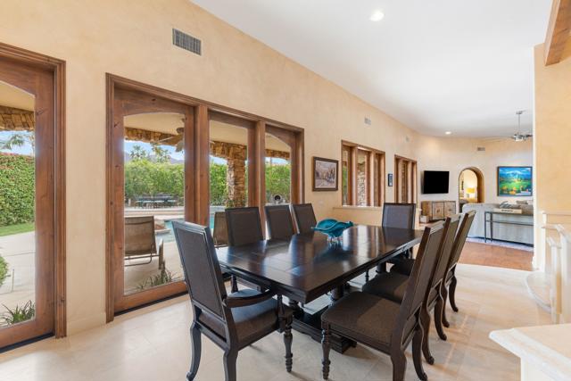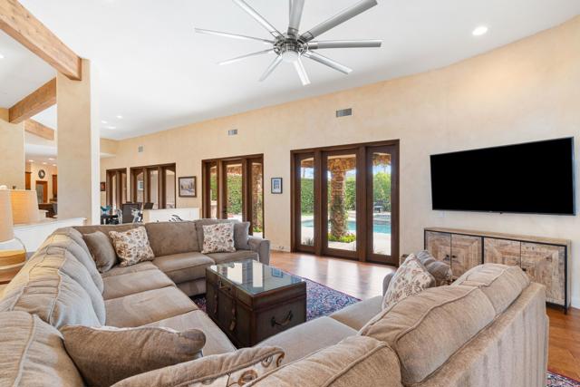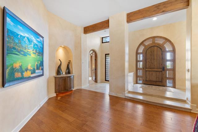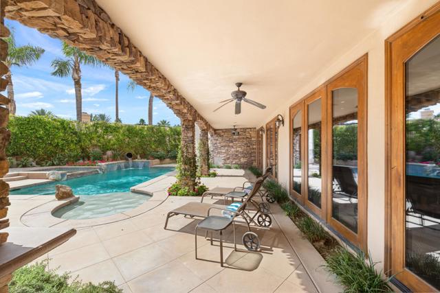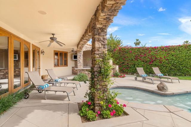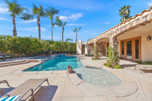 IMMACULATE CALIFORNIA SPANISH RESIDENCE IN THE GATED COMMUNITY OF THE COVE AT INDIAN WELLS -This impressive home is ideally situated at the end of a quiet cul-de-sac on a generous 12,197 SF lot. With 4,242 square feet of living area, the home offers 3 bedrooms plus a spacious convertible fourth bedroom or family room, and blends timeless architecture with open, comfortable living. A striking arched wood entry door framed with seeded glass sets the tone upon arrival, while the home's exceptional curb appeal and circular driveway create a memorable first impression. Inside, hardwood and limestone flooring flow throughout the main living areas, where high-volume ceilings, large beams, and arched architectural details enhance the sense of space and character. The floor plan is remarkably open, with one living area flowing into the next. The gourmet kitchen is well-appointed with Viking appliances, a large center island with seating, and abundant workspace. A private office and powder room are conveniently located off the main hall. The thoughtfully designed layout provides excellent privacy, with two guest suites on one side of the home and an ultra-spacious primary suite on the opposite side. Throughout the home, there's high-quality solid wood interior doors and wood-framed glass doors that open to the outdoor living areas. The south-facing pool patio is ideal for entertaining and relaxation, featuring stacked stone pillars, an outdoor kitchen, elevated dining area, and a pool and spa with water feature and fountain. The long covered patio creates seamless indoor-outdoor living in a very tranquil setting. Additional highlights include a new roof installed in 2025, double car plus golf cart garage, and an outstanding location in close proximity to restaurants, Indian Wells Coffee, Sprouts, and boutique shopping. This home represents a tremendous value within one of Indian Wells' most desirable gated communities.