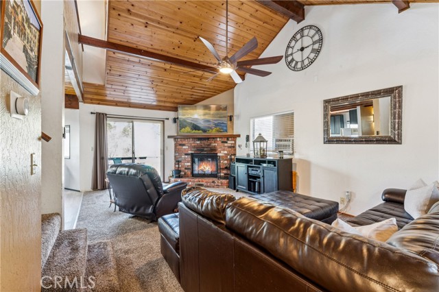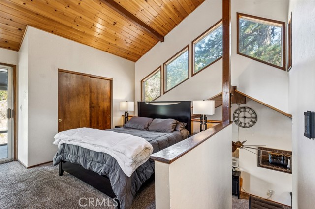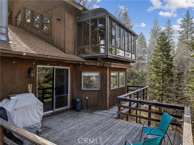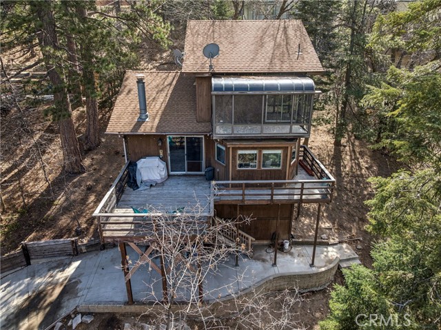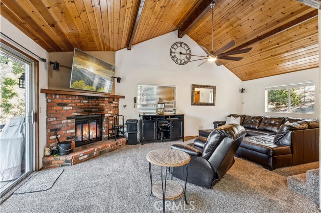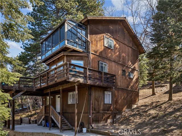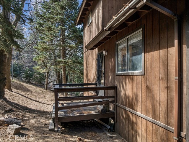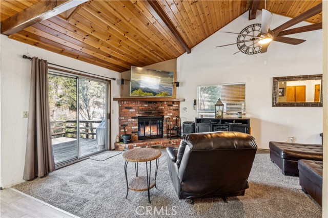 Discover your own hidden mountain retreat at the end of a quiet cul-de-sac. Set on an oversized 12,000+ sq ft lot, this property offers a sense of privacy and room to grow, whether you dream of adding a garden, workshop, or simply enjoying open space. The home feels peaceful and inviting, with forest surroundings that make every season relaxing. Inside, the living room centers around a classic brick fireplace and opens to a spacious deck perfect for morning coffee or evening sunsets among the trees. The adjoining kitchen shares a high tongue-and-groove ceiling, adding charm and a touch of cabin character. Downstairs, you’ll find two comfortable bedrooms, while upstairs a loft-style primary suite includes its own bathroom and an enclosed sunroom with serene mountain views. Just minutes to downtown Running Springs, a few miles from skiing and snow tubing at Snow Valley, and an easy drive to vacation resort towns of Lake Arrowhead and Big Bear, this home is perfectly situated for vacations or full-time living.