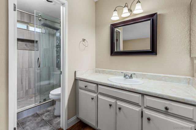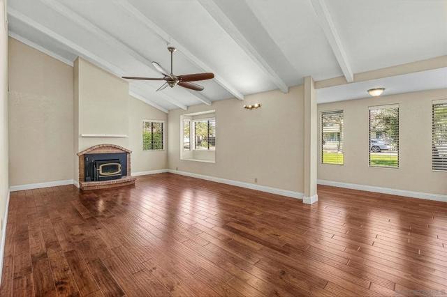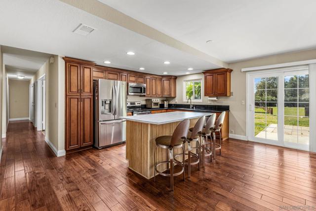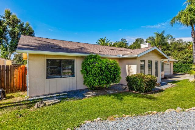 Welcome home! Appealing 4 bedroom/2 bath ranch home on quiet cul-de-sac in Ramona's San Diego Country Estates! This charming, single-story home is move-in ready. The open floor plan features vaulted ceilings in the living room with a wood-burning stove and engineered wood flooring in the common areas and hall. This property includes two remodeled bathrooms. The hall bath features a new dual sink vanity and custom tile shower. The primary has a custom tile shower with shower jets and rainhead. All bedrooms have luxury vinyl plank (no carpet). The kitchen features granite counter & tile back splash with stainless steel appliances. The inland countertop provides additional work space, storage cabinets and a counter height table. This completely usable property has an amazing mountain view with concrete patio and rear access for trailers, boats or RV storage. Full fenced back and side yards. Large tough shed and two car garage provide lots of storage. Plenty of room for a future garage/shop/pool or ADU. Walking distance to Barnett Elementary, dog park, and Simon Nature Preserve, and a 10-minute drive to downtown Ramona. Experience all the Country Estates has to offer including the clubhouse w/ restaurant, sports bar, event space, boutique hotel, 18-hole golf course, tennis and pickleball courts, hiking and biking trails, 5-acre park and a community pool and spa.