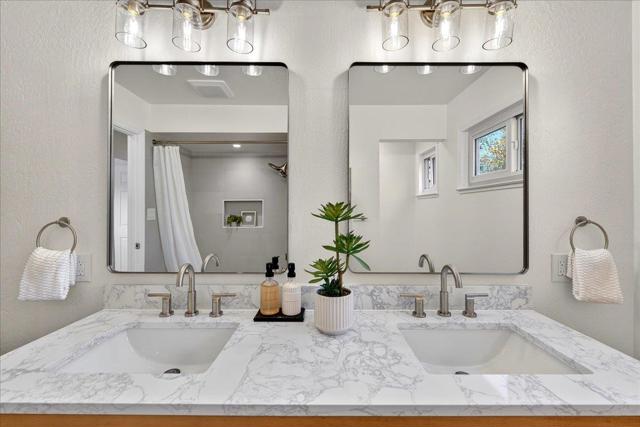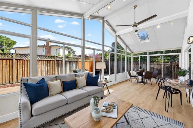 Kay-built single-story in Blossom Valley updated with quality craftsmanship and a modern aesthetic. Fresh paint inside and out. New SPC waterproof flooring and crown molding throughout. Permitted 300 sq ft Four Seasons sunroom with vaulted ceilings, skylights, and floor-to-ceiling windows adds bonus space beyond listed sq footage. Connected to central heat and air. Dual sliding door access to the backyard. Updated kitchen with granite countertops, wood cabinetry, glass-front lighted uppers, under-cabinet lighting, Thermador 5-burner gas cooktop, Electrolux ICON wall convection oven, tiled backsplash, and pendant lighting. Family room with tile fireplace and gas log insert. Living room with custom built-ins. Both with direct sunroom access. Fully remodeled bathrooms. Guest bath: dual vanity, porcelain tiled shower with rainfall showerhead, niche, and tub. Primary bath: frameless glass shower with hexagon marble mosaic tile floor and niche. 9.2kW owned SunPower solar. Owens Corning 30-year roof with transferable warranty. Dual pane windows. Two-car garage with modular shelving. Custom paver hardscaping wraps home and driveway. Artificial turf front and back with drip irrigation. Zero water waste. Minutes to Oakridge Mall, top-rated schools, Hwys 87 and 101, and VTA light rail.