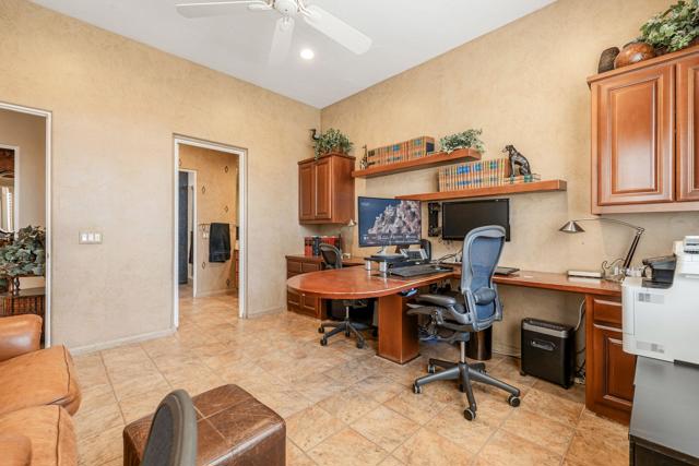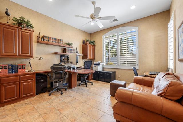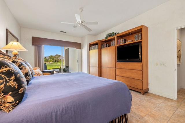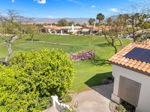 Commanding sweeping fairway and mountain views, this highly desirable Bougainvillea 1 residence overlooks the 18th hole of the Grove Course and the Indian Ridge driving range, offering an exceptional setting within Indian Ridge Country Club. Positioned on an expansive 8,712 sq. ft. pie-shaped lot, the property presents a rare opportunity to create the ultimate private desert retreat, with potential space for a pool, spa, and/or detached casita. Designed to embrace the surrounding views, the home features a bright and open great-room layout where the living room, dining area, and kitchen seamlessly flow to the outdoor patio creating effortless indoor-outdoor desert living and entertaining. The residence has been beautifully maintained and thoughtfully upgraded, showcasing tile flooring throughout, plantation shutters, custom interior wall finishes, and newer HVAC systems. The inviting living room is anchored by a custom fireplace mantle and built-in entertainment center, while the kitchen offers upgraded wood cabinetry and quality appliances for both everyday living and entertaining. The primary suite is a peaceful retreat with private patio access and picturesque fairway views, complemented by an ensuite bath featuring updated sinks and fixtures. Two additional guest suites each include their own bathrooms, with one currently configured as a comfortable home office. Additionally solar lease was installed in 2024 creating an optimum in energy savings. Club Membership is available to the buyer with no wait. Golf membership available per waitlist.