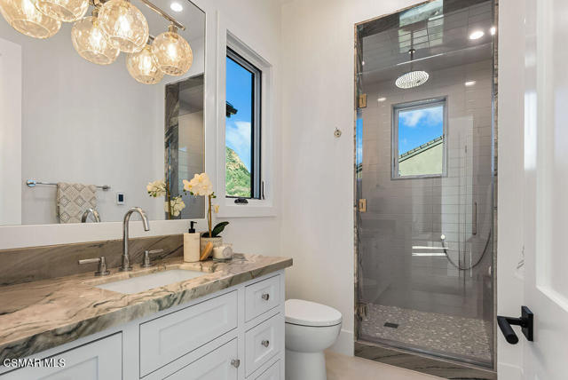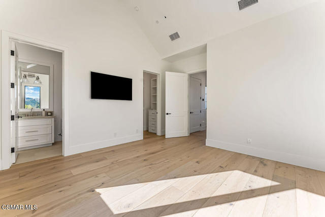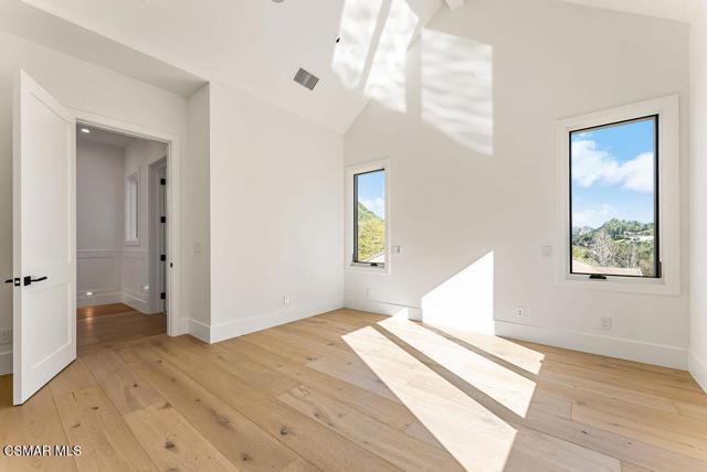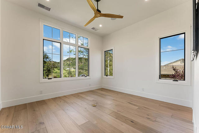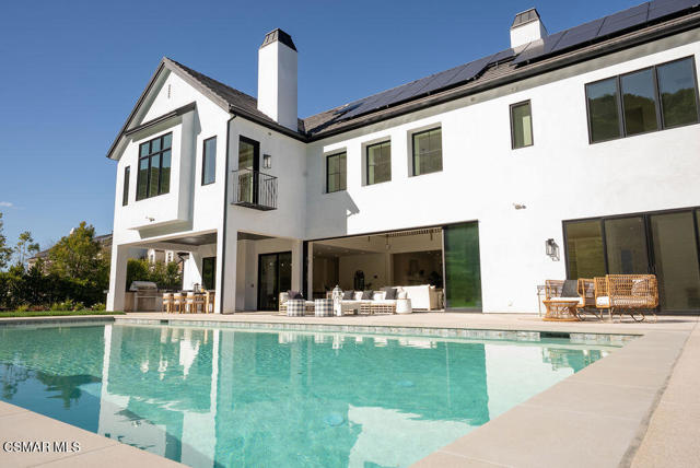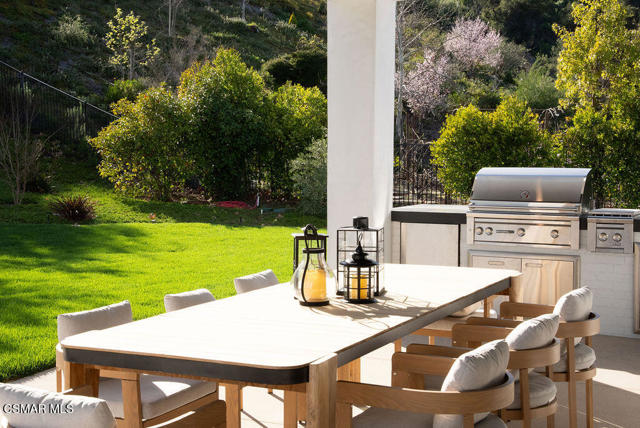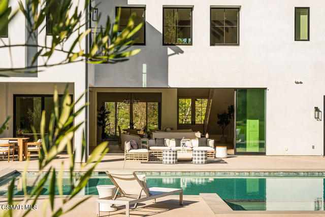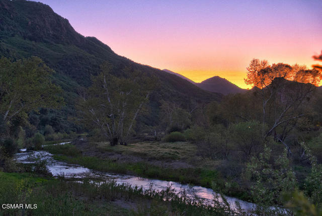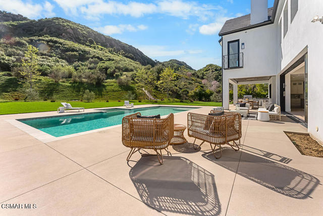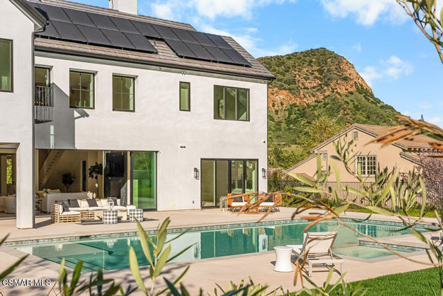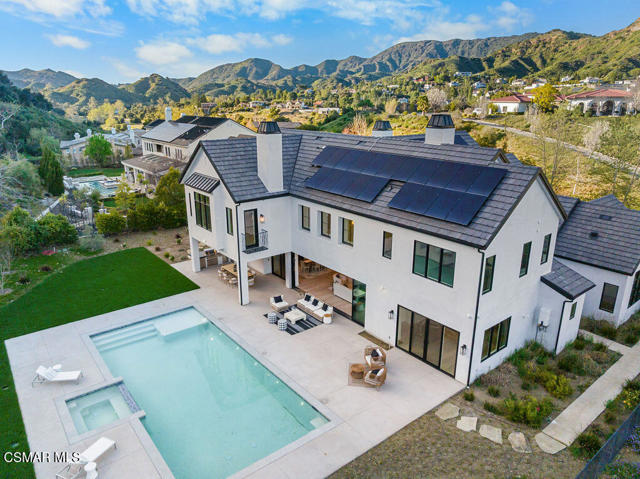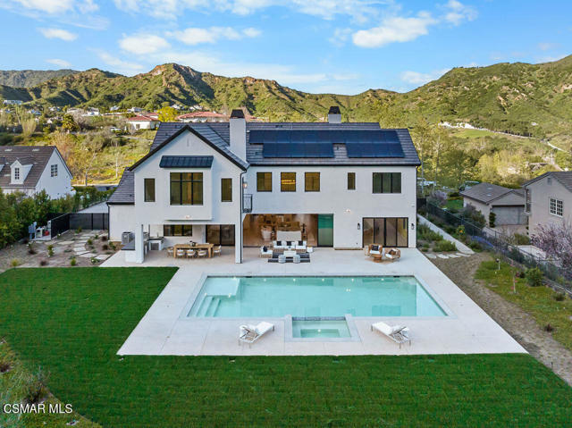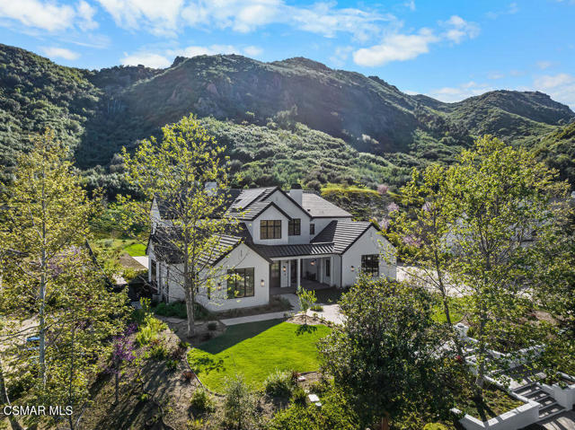 Experience the perfect blend of luxury, comfort, and California living in this newly completed Modern Farmhouse, ideally positioned behind gates and backing directly to the protected open space of the Santa Monica Mountains. With over 5,400 sq ft of refined living space on more than an acre. This estate offers fresh air, gorgeous mountain views, privacy, and the kind of elbow room that's increasingly rare. Step inside to soaring ceilings, wood-paneled accent walls, and wide-plank oak flooring that flows throughout. The heart of the home is a stunning chef's kitchen featuring high-end Thermador appliances, a massive quartzite slab island with breakfast bar seating, and custom cabinetry designed for both beauty and function. A recessed pocket wall allows the glass panels to fully retract, creating an uninterrupted transition between the main living area and the stunning backyard. A spacious game room and five en-suite bedrooms, including an incredible primary retreat with dual walk-in closets and a spa-like bath with soaking tub. These rooms ensure comfort for family and guests alike. Designed for modern living, the home is equipped with solar power supported by Tesla power wall, Control4 wiring, and 5.1 surround sound. Restoration Hardware lighting adds a sophisticated touch to every room. The outdoor spaces are equally impressive. Enjoy a resort-style spool and spa, a fully equipped outdoor kitchen, covered patio area with ceiling heaters and a large grassy backyard framed by breathtaking mountain views. Whether entertaining or unwinding, this setting delivers unforgettable moments day and night. Located just minutes from the 101 freeway, local beaches, and everyday conveniences, the community is enhanced by the natural beauty of Triunfo Creek running through it, an absolute idyllic entry to this exceptional property. A rare opportunity to own a modern estate that truly has it all: space, style, technology, and a setting that feels worlds away yet close to everything.