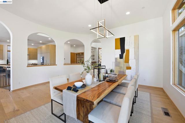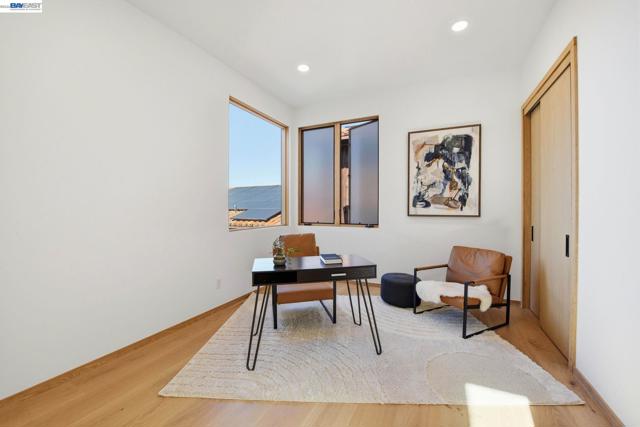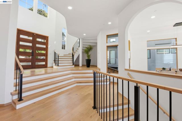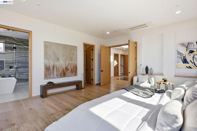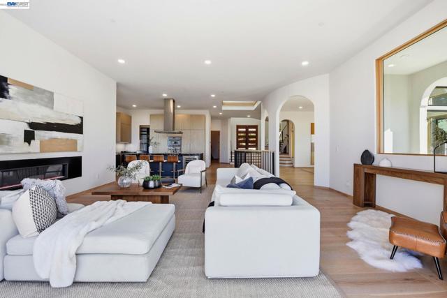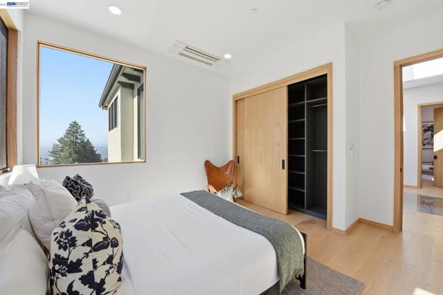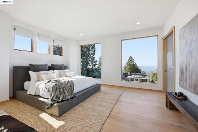 Recently built Berkeley Hills contemporary home with breathtaking panoramic Bay views and ADU. Set on a rare nearly 10,000 sq ft lot. Spectacular sunsets and sweeping vistas can be enjoyed from nearly every room. A dramatic skylight and glass-floor light well bring natural light from the roof through the upper level into the living space below, creating a striking architectural centerpiece and bright open interior. Nearly 12-ft ceilings and a folding glass door system open the living space to expansive decks framing spectacular Bay views. The chef’s kitchen boasts marble counters, Thermador appliances, and a walk-in pantry. Quality craftsmanship defines this residence, showcasing white oak and porcelain tile floors, customized rift oak doors, and top-of-the-line finishes throughout. The serene primary suite features large picture windows and a spa-like bath with radiant heated floors. Rare ~813 sq ft attached ADU with private entrance, full kitchen, living area, and separate meter—ideal for guests, extended family, or rental income. Additional highlights include AC, EV charging, smart switches, 1 GB fiber internet with wired connections in all rooms, a two-car garage, and extra driveway parking. Conveniently located near Albany and North Berkeley shopping, dining, parks, trails.
