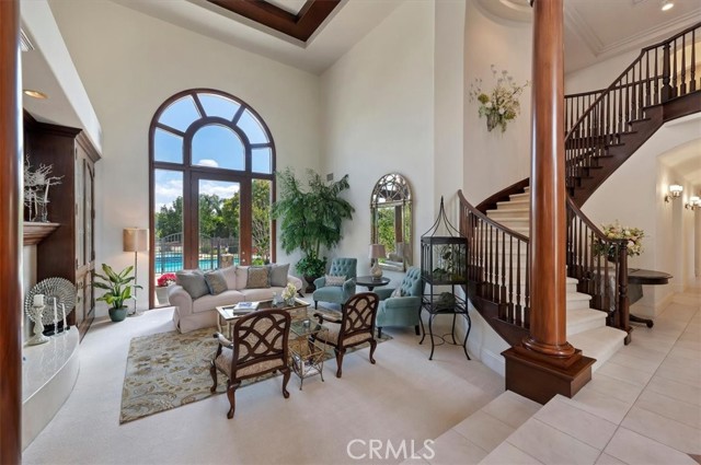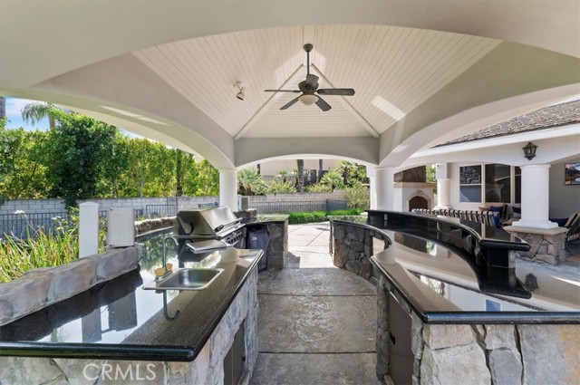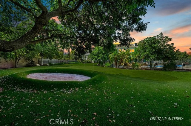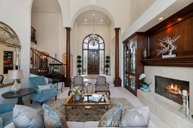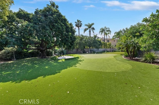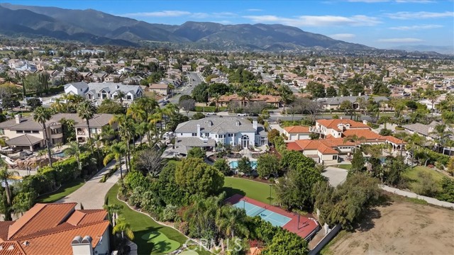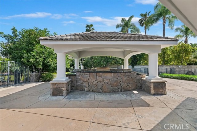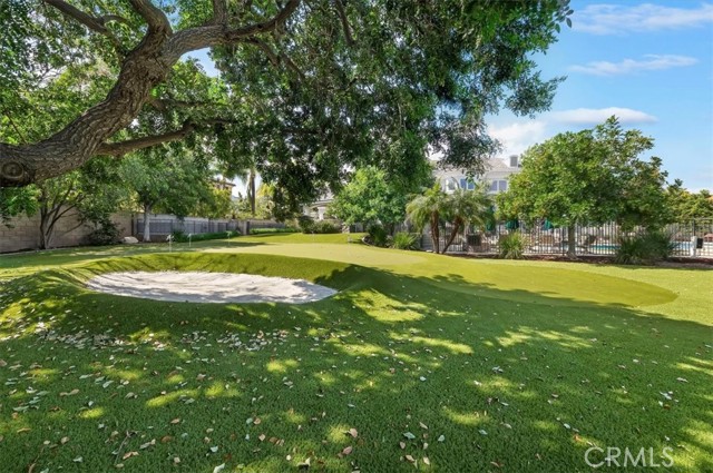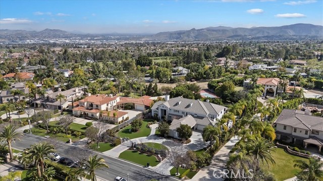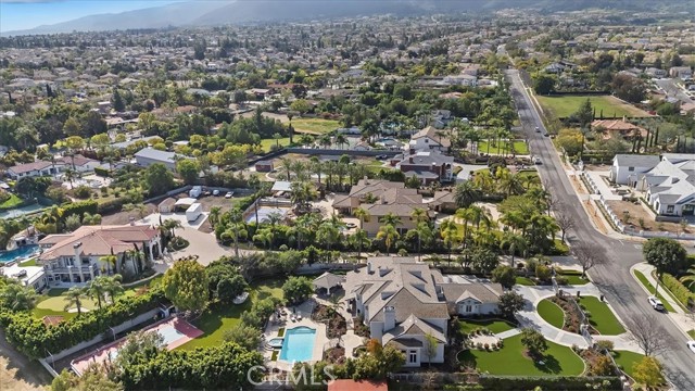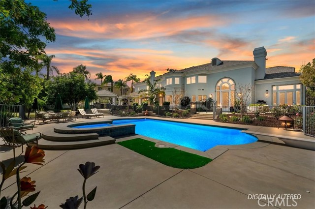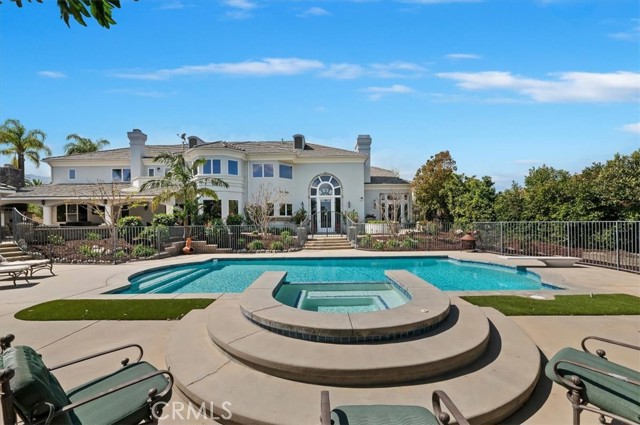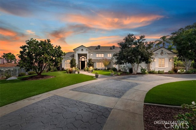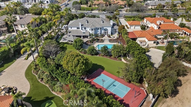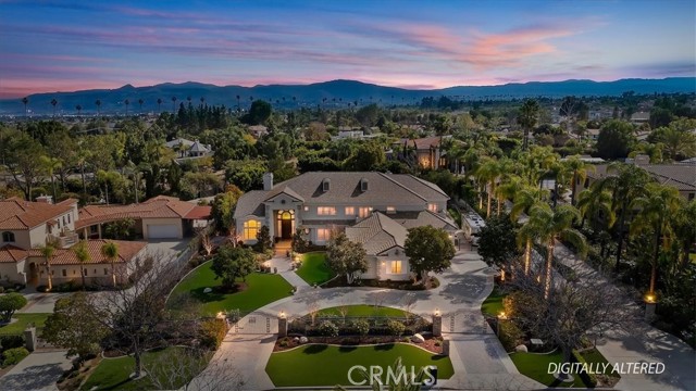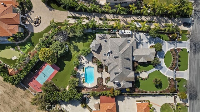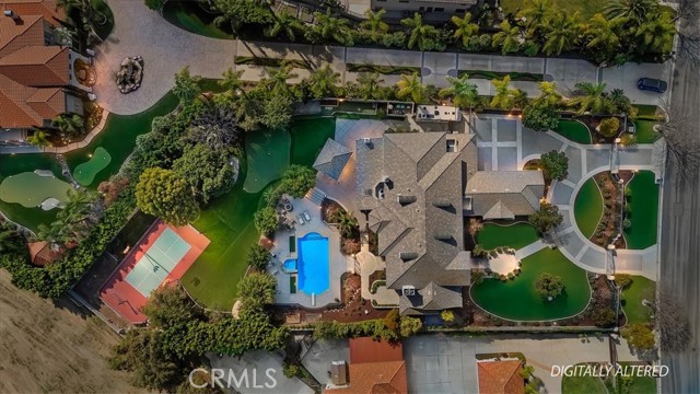 Set behind custom iron gates in an exclusive pocket of South Corona, this exceptional estate blends timeless architecture, privacy, and resort-style amenities. A circular drive welcomes guests to a dramatic entry featuring a 10-foot mahogany door, soaring 24-foot ceilings, crystal chandelier, marble fireplace, and custom mahogany display cabinetry—an unforgettable first impression. Thoughtfully designed by acclaimed Newport Beach architect Dennis Cherry, the home balances elegance with livability. The chef’s kitchen flows seamlessly into the family and billiard rooms and showcases granite countertops, dual Asko dishwashers, Wolf steam ovens, Viking commercial range, Sub-Zero refrigerator, butler’s pantry, walk-in pantry, and wine cellar—perfectly designed for both everyday living and entertaining. The resort-inspired grounds are truly one of a kind. Mature trees and lush landscaping surround a pool with diving board, lighted pickleball court, batting cage, and an impressive golf practice facility featuring a green, bunker, and 30+ yard pitching area. Covered outdoor living spaces, a barbecue area, and zoned speakers create the ideal setting for gatherings or quiet relaxation. Additional highlights include a library, den with surround sound, private guest/in-law suite with separate entrance, oversized laundry room with dual washers and dryers, and an upstairs activity room with built-in workstations and balcony access. The luxurious primary suite offers a peaceful retreat with sitting area, spa-style bath with jetted tub, dual-head shower, and expansive walk-in closet. Car enthusiasts and hobbyists will appreciate the 5-car garage with EV charging, workbench area, storage lockers, central vacuum, and additional attic storage, along with paved motorhome parking with power. Built with quality and efficiency in mind, the home also features three HVAC systems, whole-house fans, dual security systems, recirculating hot water, and extensive storage throughout. A rare offering combining privacy, recreation, and refined living—delivering a true luxury lifestyle in the heart of Corona.