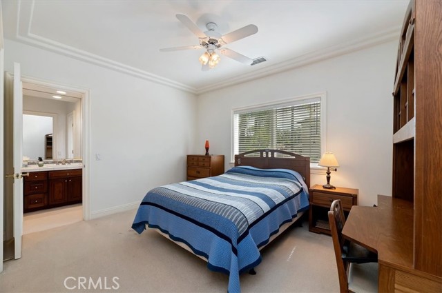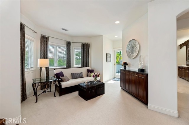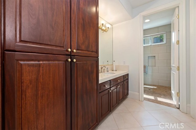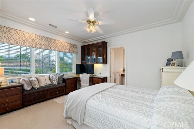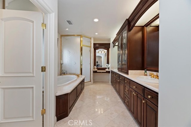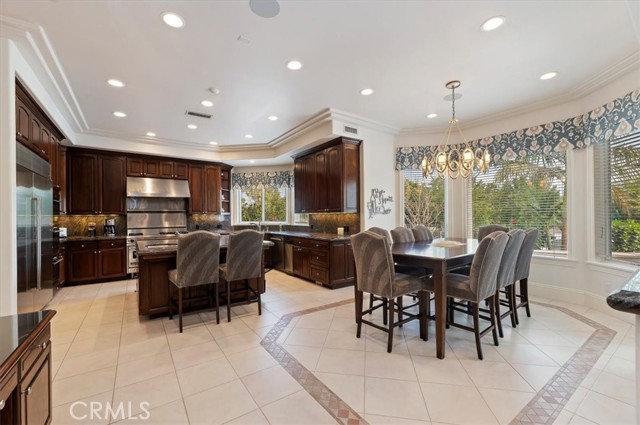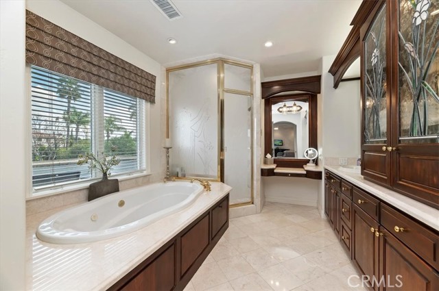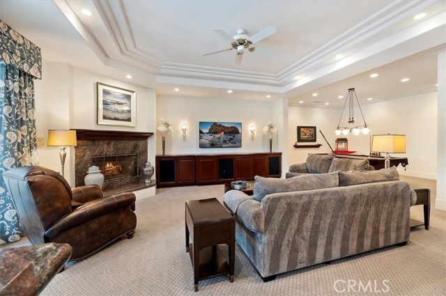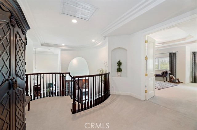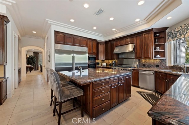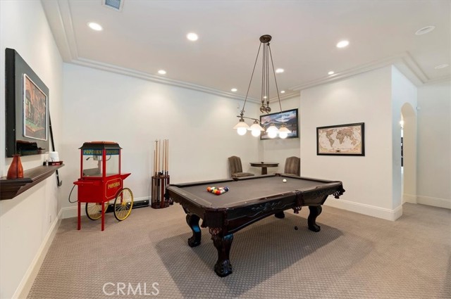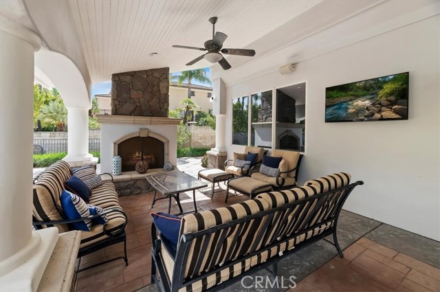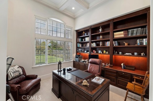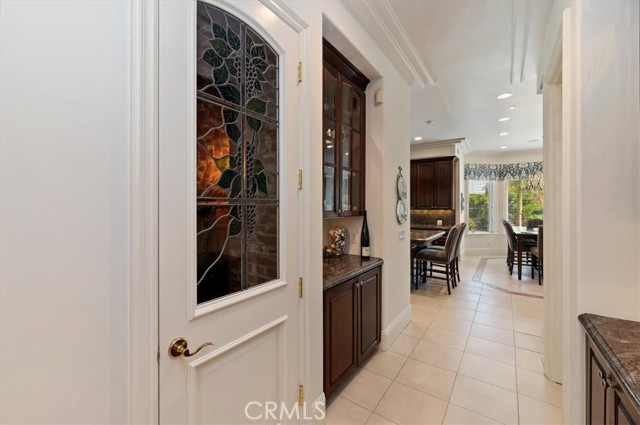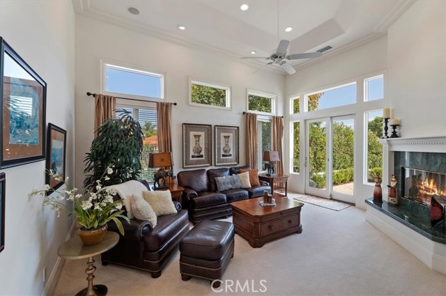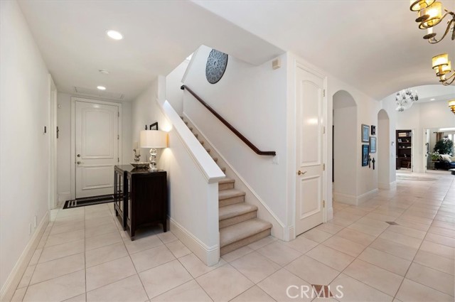 Set behind custom iron gates in an exclusive pocket of South Corona, this exceptional estate blends timeless architecture, privacy, and resort-style amenities. A circular drive welcomes guests to a dramatic entry featuring a 10-foot mahogany door, soaring 24-foot ceilings, crystal chandelier, marble fireplace, and custom mahogany display cabinetry—an unforgettable first impression. Thoughtfully designed by acclaimed Newport Beach architect Dennis Cherry, the home balances elegance with livability. The chef’s kitchen flows seamlessly into the family and billiard rooms and showcases granite countertops, dual Asko dishwashers, Wolf steam ovens, Viking commercial range, Sub-Zero refrigerator, butler’s pantry, walk-in pantry, and wine cellar—perfectly designed for both everyday living and entertaining. The resort-inspired grounds are truly one of a kind. Mature trees and lush landscaping surround a pool with diving board, lighted pickleball court, batting cage, and an impressive golf practice facility featuring a green, bunker, and 30+ yard pitching area. Covered outdoor living spaces, a barbecue area, and zoned speakers create the ideal setting for gatherings or quiet relaxation. Additional highlights include a library, den with surround sound, private guest/in-law suite with separate entrance, oversized laundry room with dual washers and dryers, and an upstairs activity room with built-in workstations and balcony access. The luxurious primary suite offers a peaceful retreat with sitting area, spa-style bath with jetted tub, dual-head shower, and expansive walk-in closet. Car enthusiasts and hobbyists will appreciate the 5-car garage with EV charging, workbench area, storage lockers, central vacuum, and additional attic storage, along with paved motorhome parking with power. Built with quality and efficiency in mind, the home also features three HVAC systems, whole-house fans, dual security systems, recirculating hot water, and extensive storage throughout. A rare offering combining privacy, recreation, and refined living—delivering a true luxury lifestyle in the heart of Corona.
