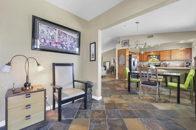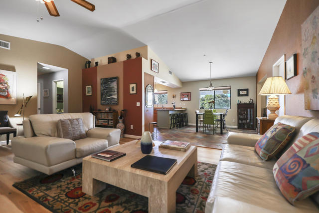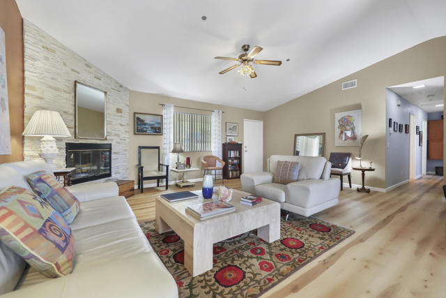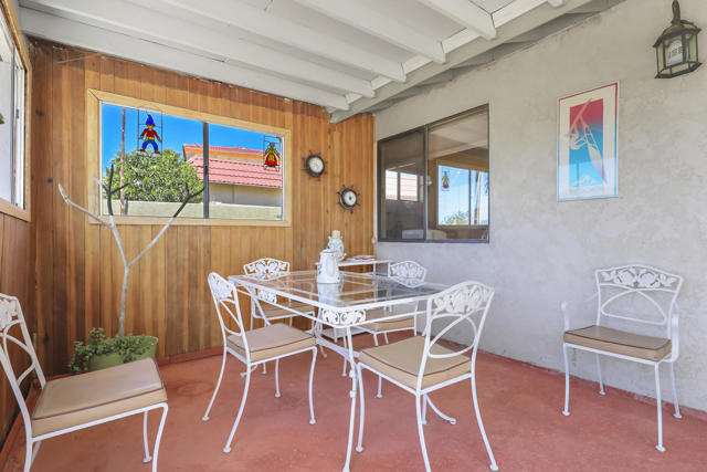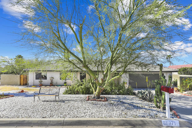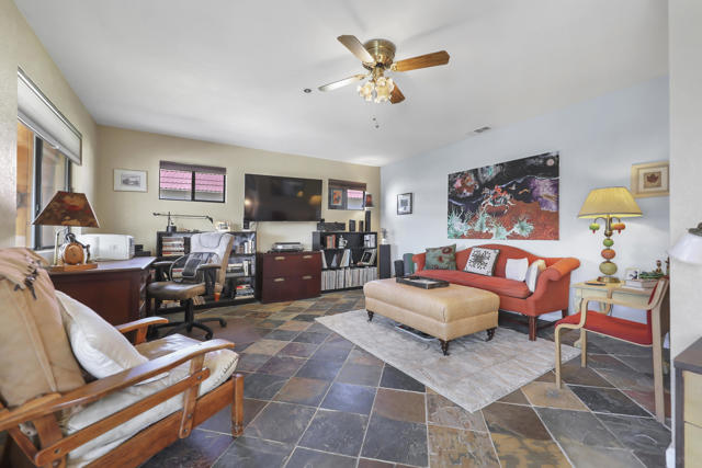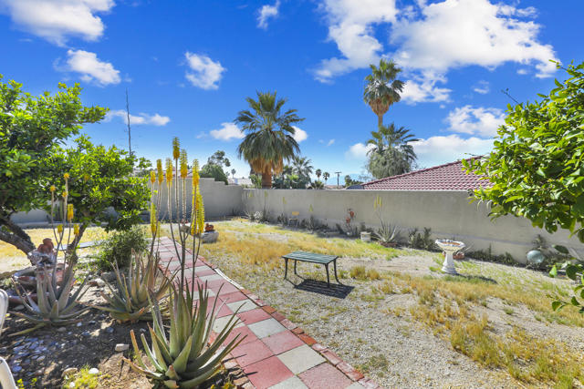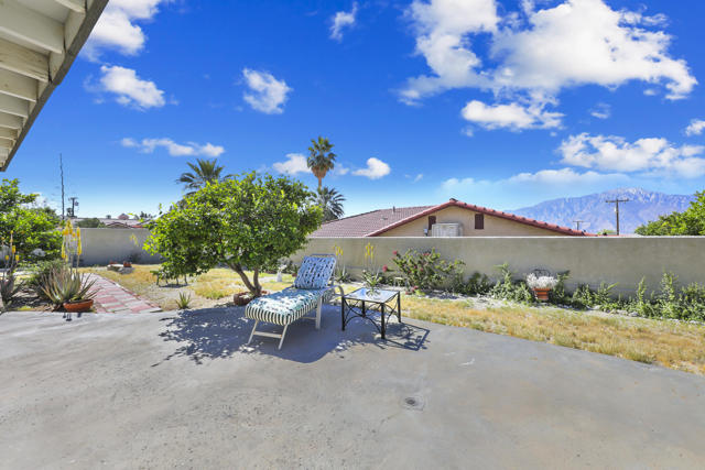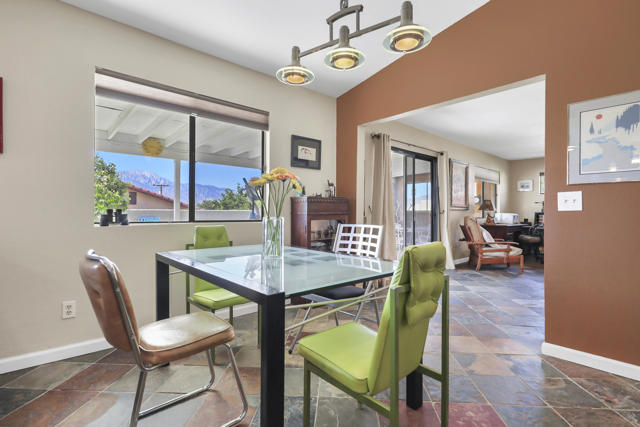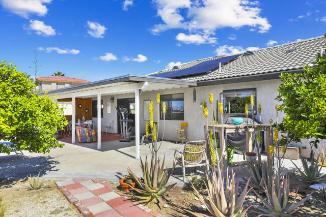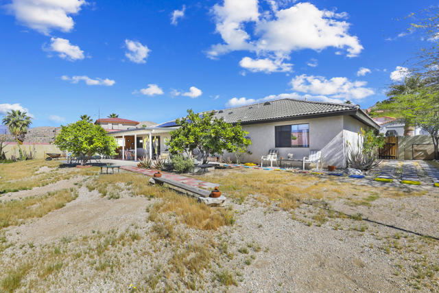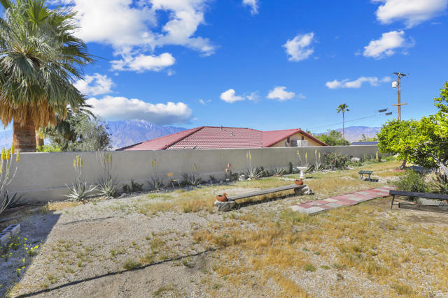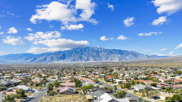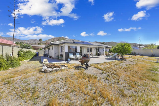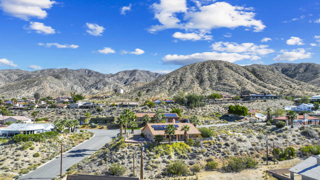Perched above the city, this private desert retreat offers an elevated blend of serenity, style, and effortless living, framed by sweeping mountain views. Designed for both relaxation and versatility, the expansive, fully enclosed backyard presents a rare opportunity to create a custom resort setting with room for a pool and spa. With NO HOA and exceptional short-term rental or investment potential, the property is ideally positioned just minutes from Palm Springs and Joshua Tree National Park. A generous covered patio extends the living experience outdoors--perfect for entertaining or enjoying tranquil desert evenings. Inside, a thoughtfully designed layout features three bedrooms plus a den, offering flexibility for guests, work, or leisure. Slate and laminate flooring provide a cohesive, low-maintenance aesthetic throughout. The living room is anchored by a striking stacked stone fireplace, creating a warm and inviting focal point. The kitchen offers abundant cabinetry and opens to picturesque backyard and mountain vistas. The primary suite serves as a peaceful retreat and walk-in closet, while two additional bedrooms ensure comfort and privacy for guests. Bonus - owned solar. Call today to schedule your appointment to view this home.